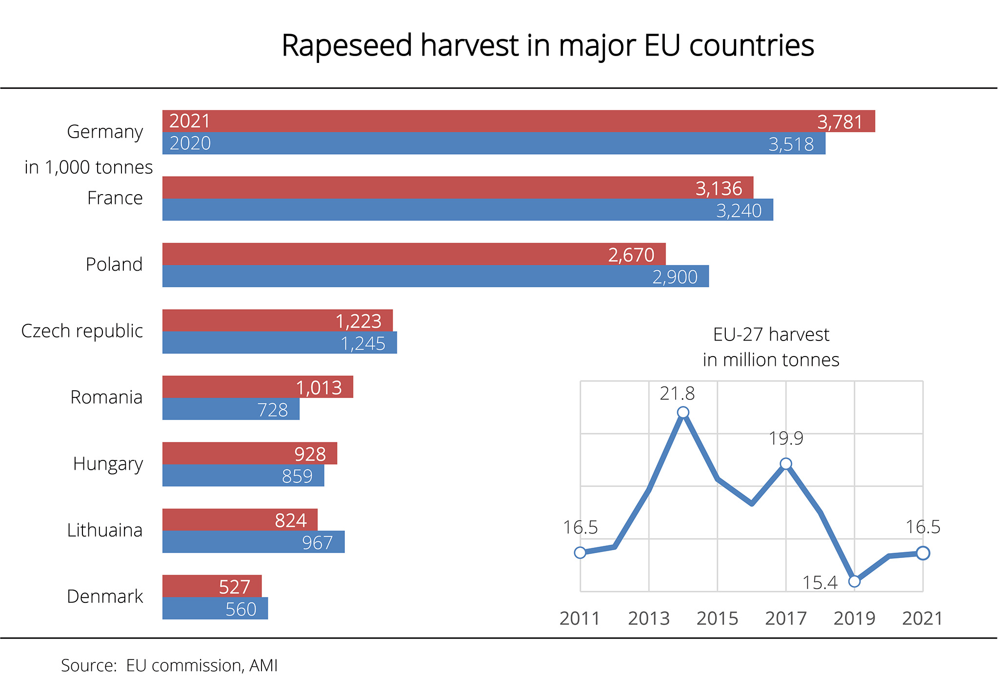 According to information published by the EU Commission, the rapeseed harvest in the EU-27 was slightly larger in 2020 than in 2019. It is pegged at 16.1 million tonnes, which translates to a rise of just less than 5 per cent compared to 2019. According to investigations conducted by Agrarmarkt Informations-Gesellschaft (mbH), the climb is a result of harvest increases in Germany, Poland, Lithuania and the Czech Republic. It more than offset production declines in other member states. Nevertheless, the result is once again short of the average harvest figure.