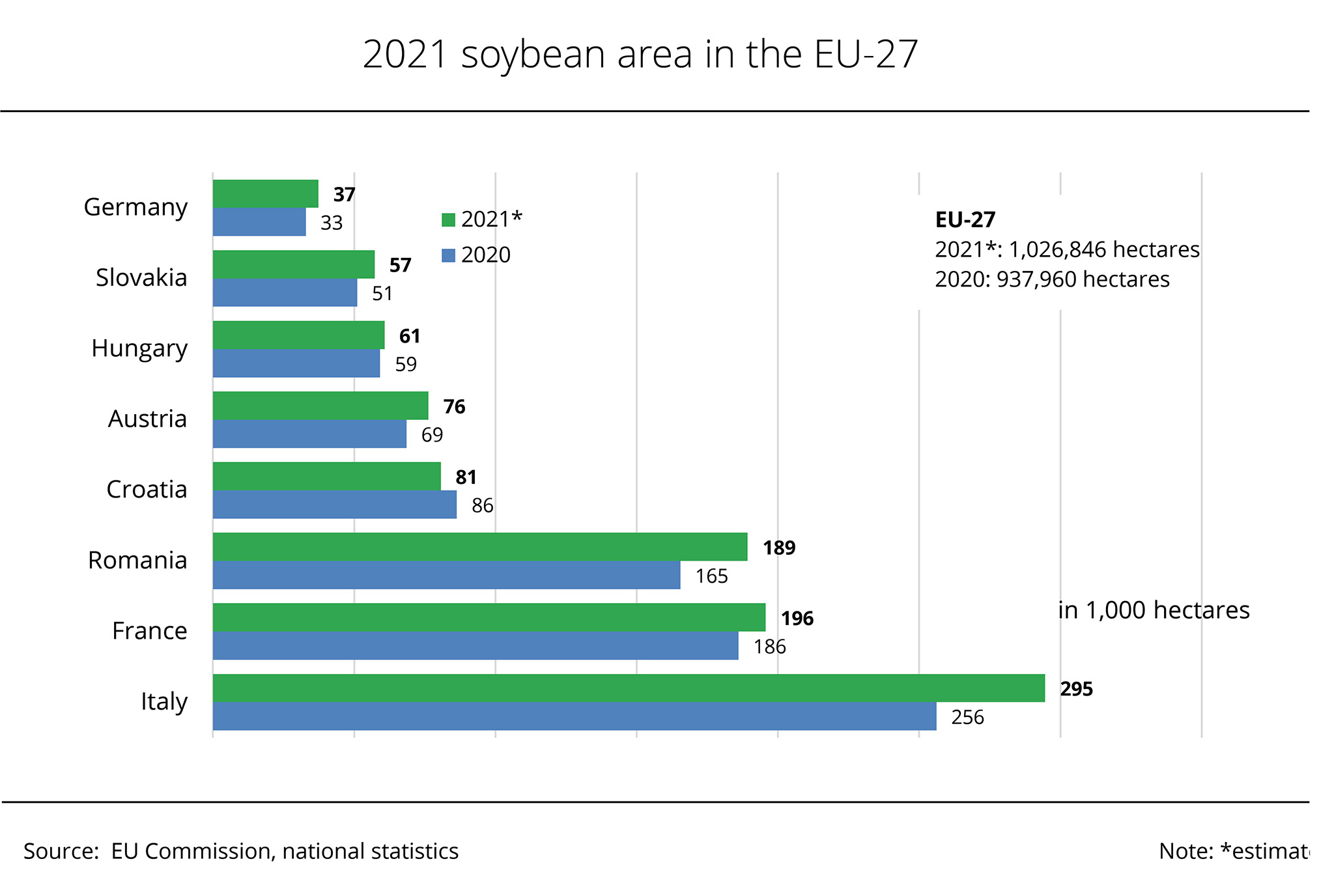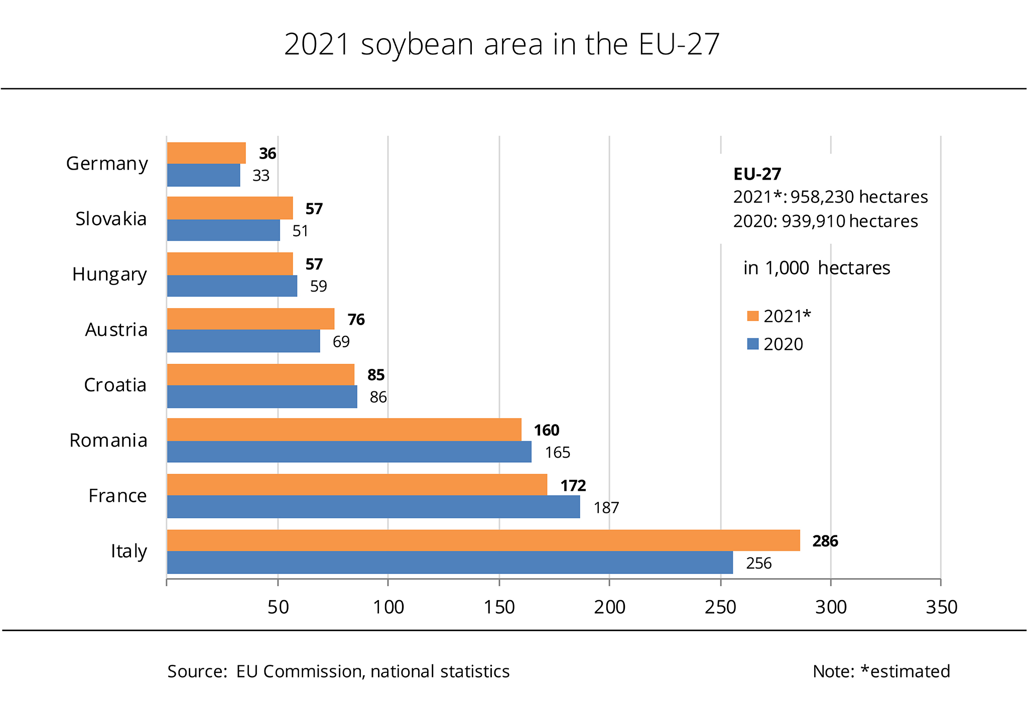 The most important legume crop in the EU-27 is soybean, which accounts for a slightly lower share of around 43 per cent of grain legume production. Farmers harvested around 2.8 million tonnes in 2021, approximately 8 per cent more than the previous year. This is mainly due to a 7 per cent growth in yield, since the soybean area was only marginally expanded. The second most important legume crop in the EU-27 is feed pea. At 2.3 million tonnes, production surged 13 per cent from 2020. The main reason is a 9 per cent expansion in area planted. Yields were up 3 per cent year-on-year. In the long-term comparison, production of feed peas was up 7 percent and that of soybeans 5 per cent.
