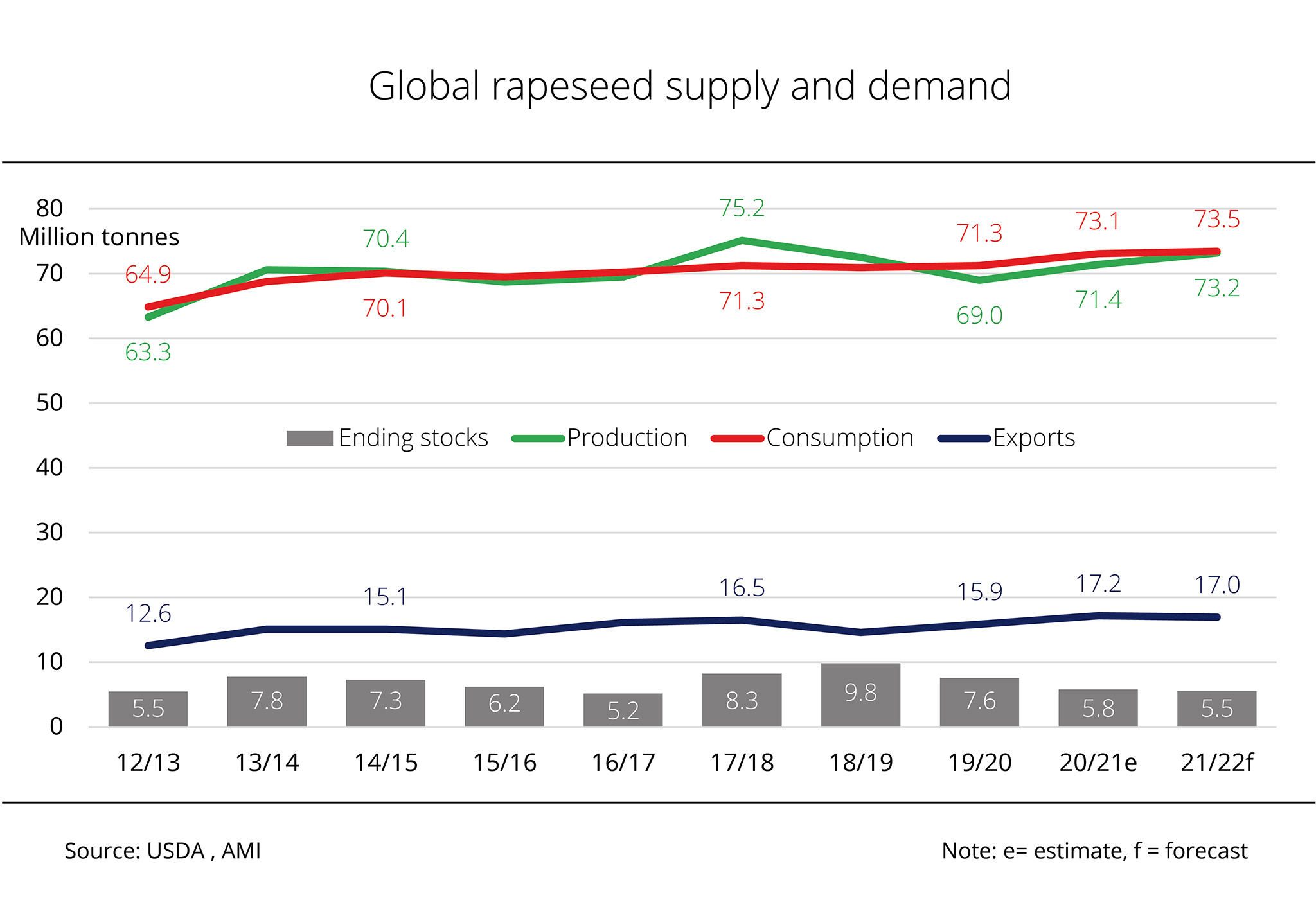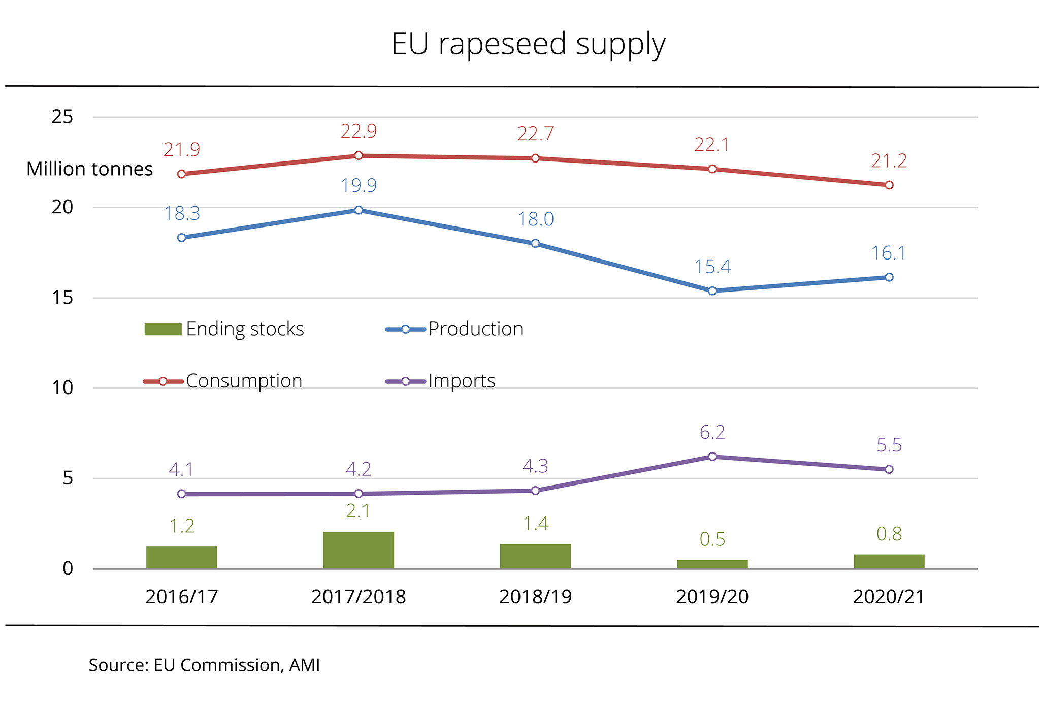 EU-27 rapeseed production in 2020/21 exceeded the previous year's output. Consumption is estimated lower, leading to reduced import demand. Nevertheless, ending stocks are expected to grow.