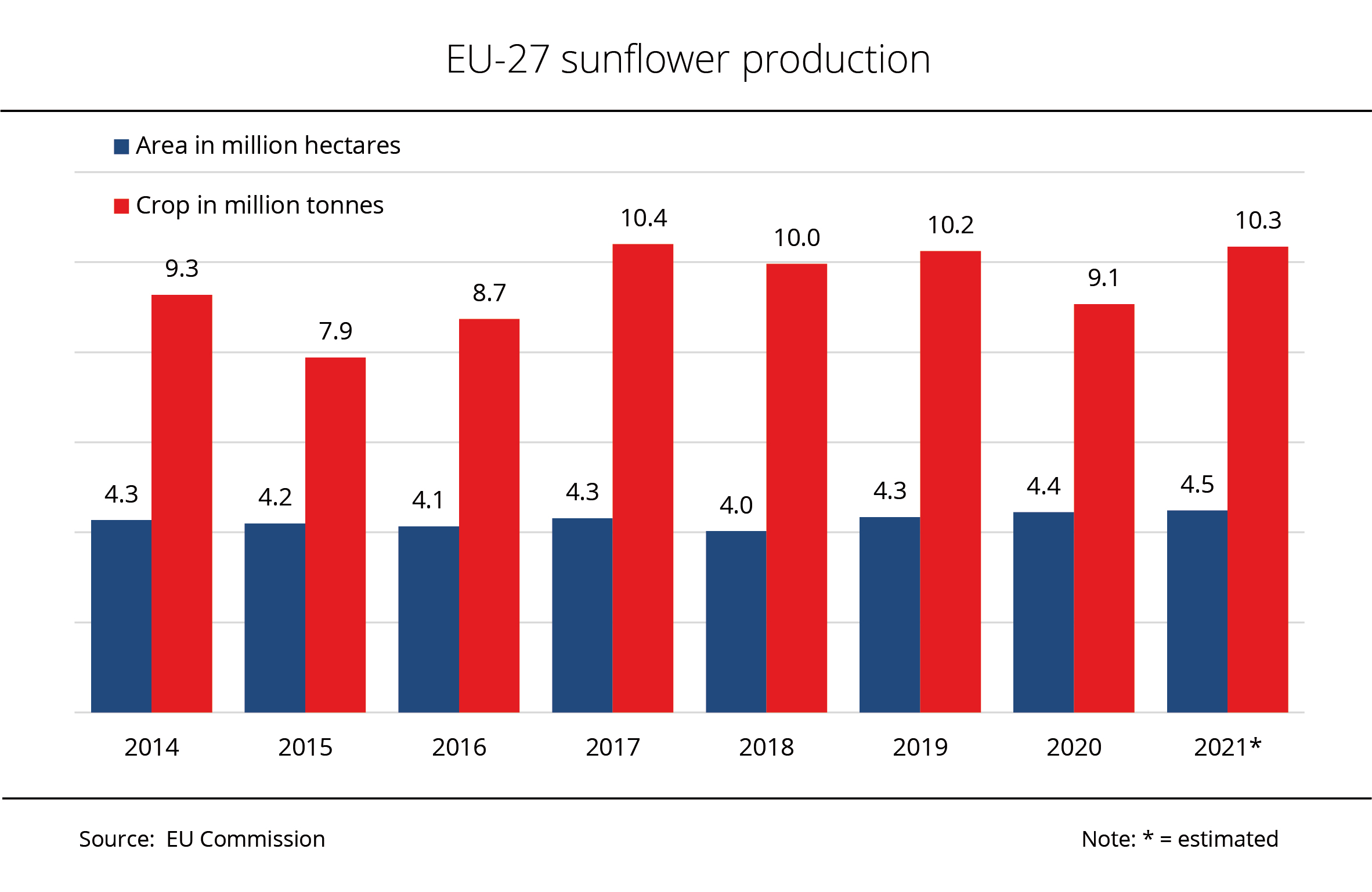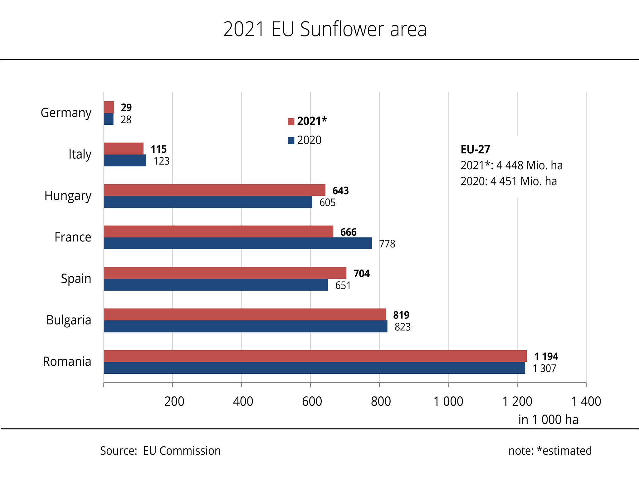 In the EU-27, the 2021 harvest of sunflowerseed was considerably larger than the previous year. It also far exceeded the long-term average. However, the 2017 record level was not topped.