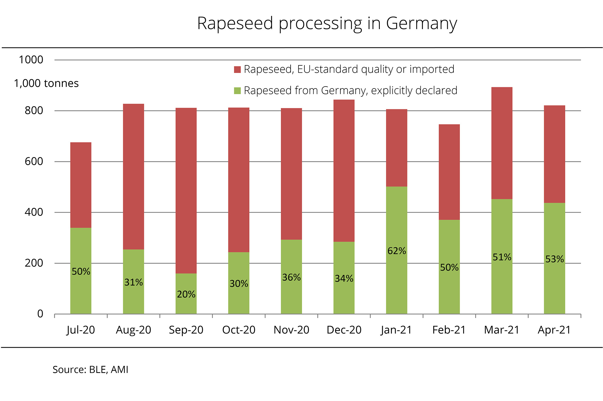 The share of imported rapeseed in the oil mills' feedstock base has never been bigger than in the first half of the current crop year. This seems paradoxical in some respects, as Germany's 2020 rapeseed harvest, of around 3.5 million tonnes, was larger than the previous year's harvest (2.8 million tonnes). According to Agrarmarkt Informations-Gesellschaft (mbH), these figures show that the domestic share in rapeseed supply to German oil mills is not a question of the domestic harvest alone. The price is a key factor too, and offers from abroad were obviously quite attractive for processors in Germany.