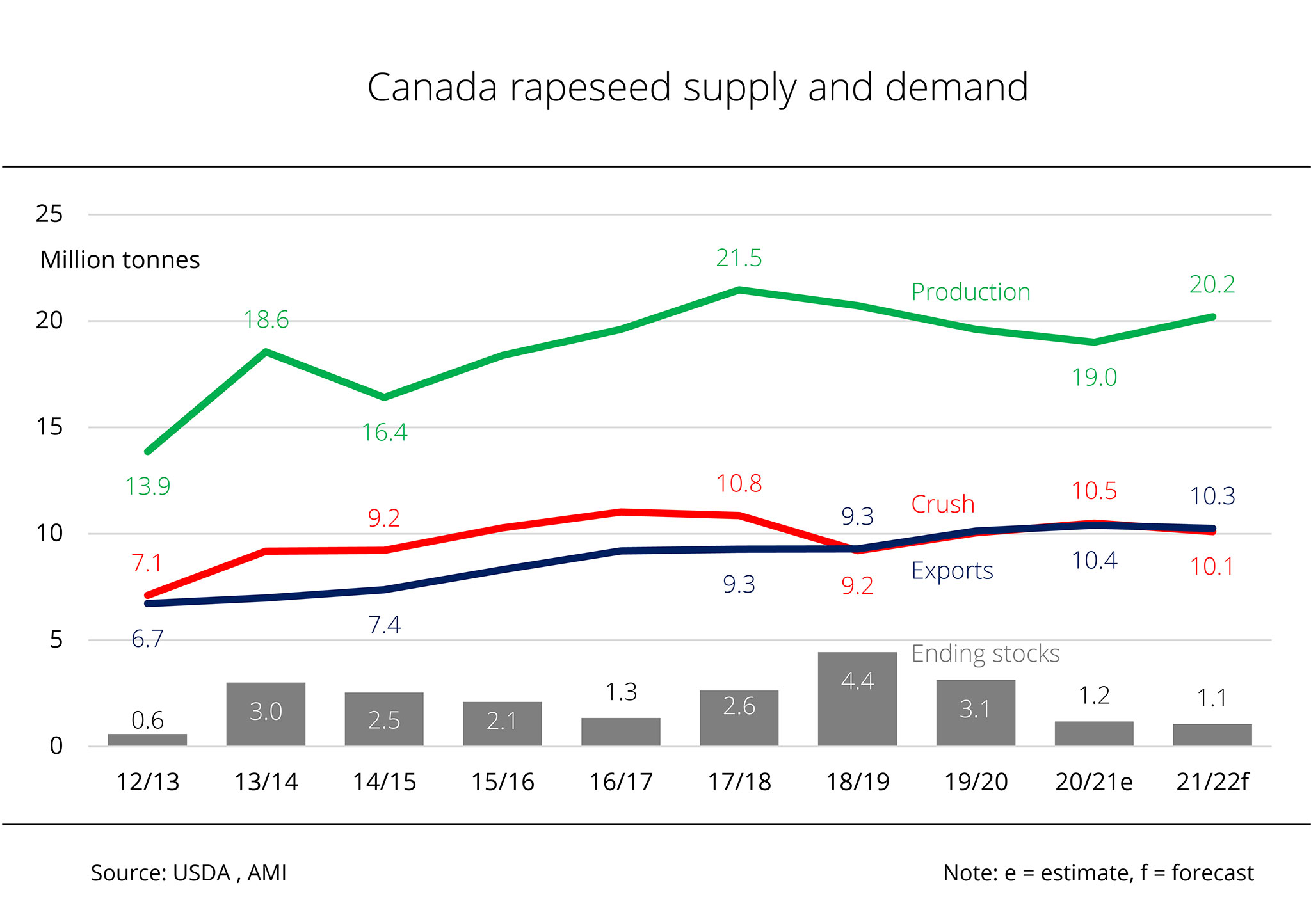The USDA put 2021/22 global ending stocks of rapeseed at 3.65 million tonnes. This would not only be a 40 per cent decline on the 2020/21 marketing season's ending stocks, but also the lowest level on record.