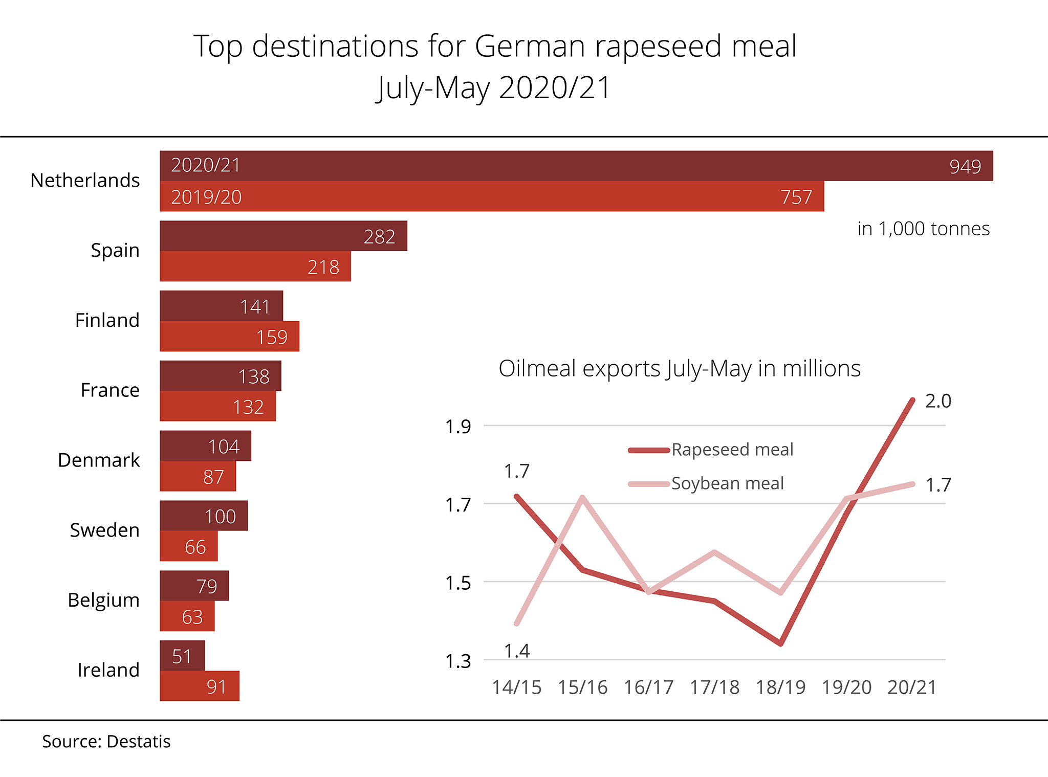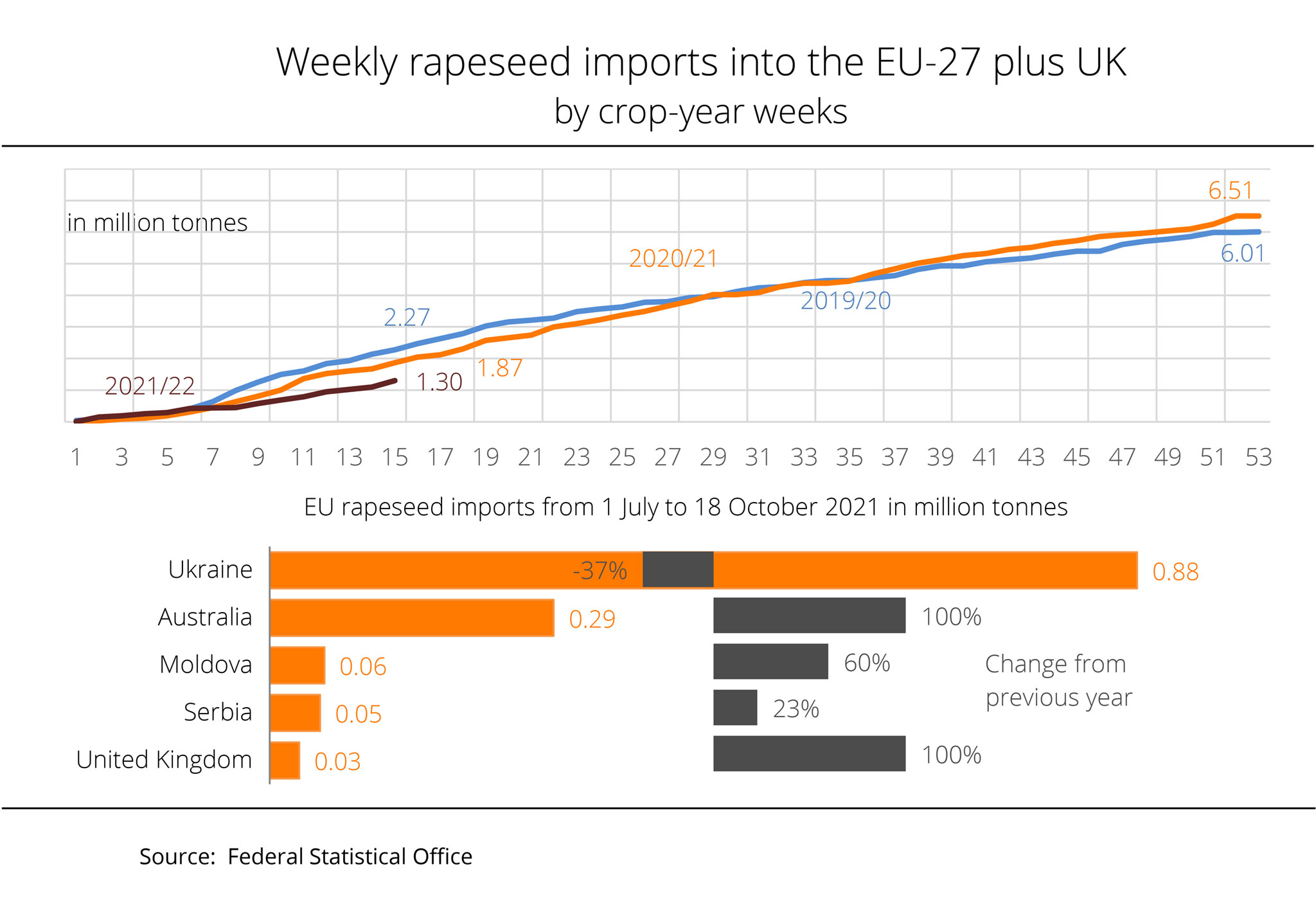 However, the availability of rapeseed on the global market is severely limited as a result of considerable harvest losses suffered by Canada, the main rapeseed supplier. Consequently, the market has had to rely on Australian rapeseed already at the beginning of the season. Normally, Australia is a guarantor of rapeseed deliveries in the second half of the marketing year. Even the UK, which was still a member of the EU at the same time a year earlier, is now sourcing imports from third countries. Restrained deliveries from the Ukraine have also added to the gap. Although the harvest was larger, rapeseed deliveries from Ukraine were down 37 per cent year-on-year. This shortfall was only insufficiently offset by the larger deliveries from Moldova and Serbia.