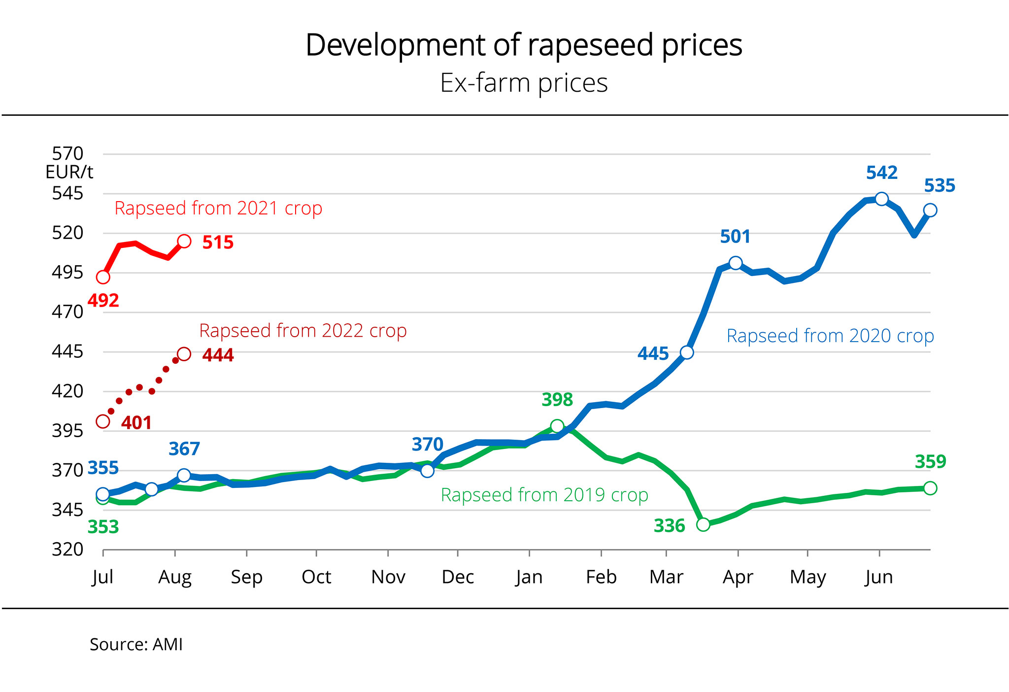 Whereas at the end of January, the price was reported at EUR 411 per tonne free to warehouse, it was up to EUR 469 per tonne only five weeks later. Such a strong price increase has not been witnessed in the past decade. There is no end in sight for soaring rapeseed prices.