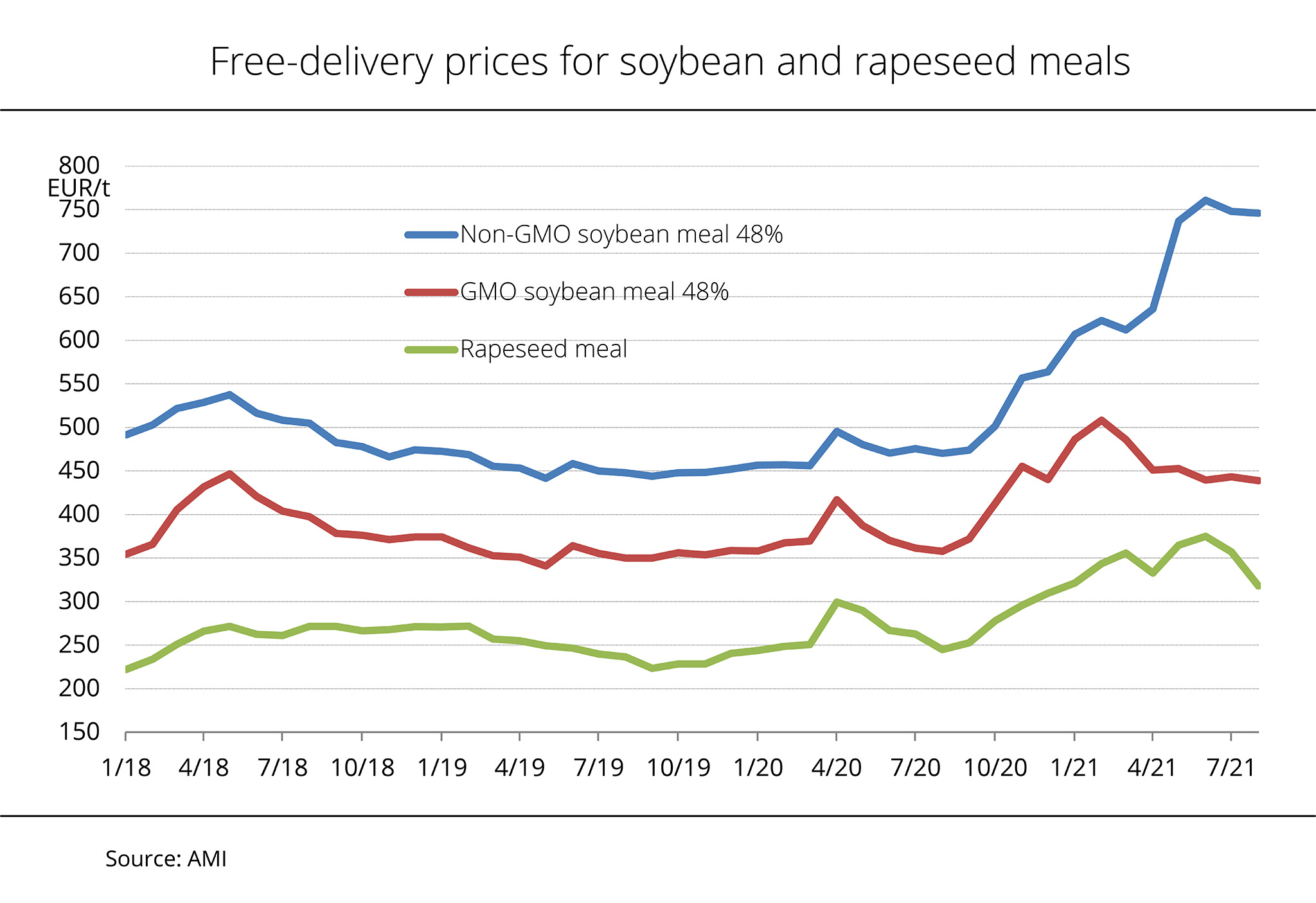Soybean meal prices in Chicago strengthened considerably over the past several months, leading to a rise in soybean and rapeseed meal prices in the German spot market. At the same time, demand for GMO-free soybean meal was brisk.