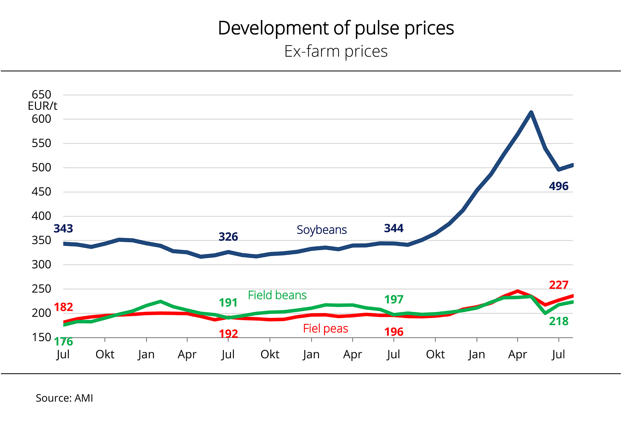 The total area of land planted with feed peas and other legumes for the 2021 harvest was expanded 11 per cent to 219,000 hectares. This was despite the fact that, according to Agrarmarkt Informations-Gesellschaft (mbH), there was less scope for producers to make decisions in the spring than there was in the previous year. The area for winter-planted crops for the 2021 harvest had been expanded to its old extent, because the weather was right at the time of planting. Nevertheless, farmers decided to plant more pulses, especially peas (+18 per cent) and sweet lupins (+32 per cent). The soybean area remained stable, whereas the field bean area declined 2 per cent.