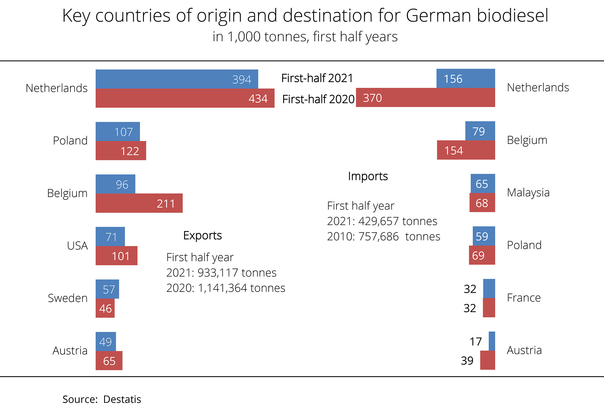 According to figures published by the German Federal Statistical Office, Germany exported around 933,117 tonnes of biodiesel in the first half of 2021 while importing only 429,657 tonnes. The Netherlands, the main EU marketplace for trading biodiesel, continued to be the primary trading partner, accounting for 42 per cent and 36 per cent of total exports and imports respectively. However, imports decreased significantly by 60 per cent. According to investigations conducted by Agrarmarkt Informations-Gesellschaft (mbH), larger import volumes also came from Belgium, Malaysia and Poland, although they were smaller than in the year-earlier period. Imports were dominated by supply from other EU countries (84 per cent). Malaysia was the most important non-EU supplier country, once more ranking third, but only providing just less than 65,000 tonnes of biodiesel.
