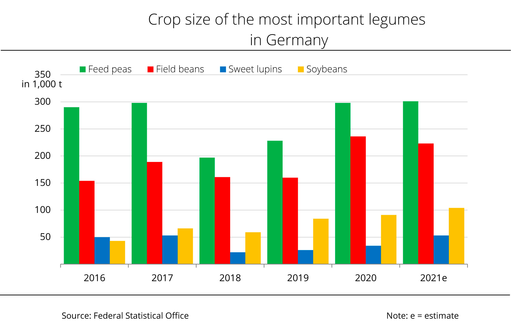 The conditions for plant growth and pod formation were good, but the rainy summer cut yields this year, especially in feed peas. As a result, the pea harvest was up only 1 per cent on the previous year at 301,000 tonnes. Field beans were also affected by the poor weather, with 223,000 tonnes harvested, which is around 6 per cent less than in 2020. Soybean production is seeing a sharp rise and expected to reach 104,000 tonnes. This would be an increase of 14 per cent, although the area planted remained unchanged. Sweet lupins were left unperturbed by the wet summer. As they were mostly planted in drier sites, they experienced optimal conditions for the first time in years. Based on a 13 per cent increase in yield, the harvest volume is estimated to reach 53,000 tonnes. This would translate to a 56 per cent rise on the year.