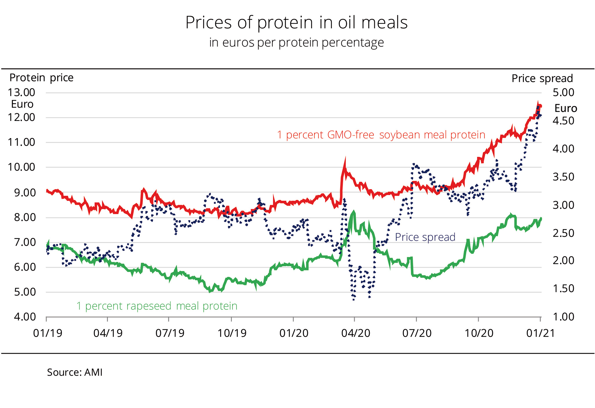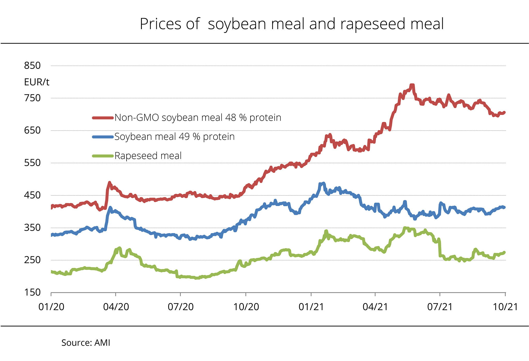 Prices for rapeseed meal and especially GMO-free soybean meal increased significantly in the second half of the year 2020. At the beginning of the crop year, in July 2020, GMO-free soybean meal with 48 per cent crude protein still cost EUR 456 per tonne fob Hamburg. Six months later, it was up around EUR 146 per tonne at EUR 602 per tonne. This translates to a price of EUR 4.60 per protein percentage per tonne at the beginning of January 2021 compared to EUR 3.10 at the beginning of July 2020. The rise was sparked by sharp price increases in Chicago driven by concerns over drought-related harvest losses in South America. Also, supply of soybean meal in Argentina waned, fuelling concerns of potential supply bottlenecks in Germany. Supply in Brazil – the main supplier of GMO-free soybean meal – also tightened, because China literally swept the market over the past several months. Buyers were also seeking GMO-free soybean meal in other countries. As a result, the focus shifted to European produce, such as Danubian soy, which was yet another factor that added to the price rise.