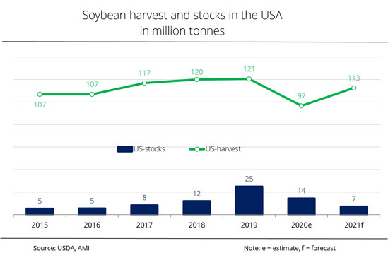 In its forecast of world soy production, the USDA expects an all-time high of 384 million tonnes. The record estimate is due to the almost 6 million tonne US harvest increase compared to the previous year and positive outlooks for South America (+3 million tonnes for Argentina and +6 million tonnes for Brazil). However, this trend is paralleled by a rise in demand in 2021/22. At 378 million tonnes, the USDA anticipates an increase of 15 million tonnes over the 2020/21 marketing year, mainly based on the consumption forecast for China, which has been raised once again. In China, soybean consumption could increase to just less than 118 million tonnes in 2021/22, which would be up around 6 million tonnes on the previous marketing year. According to Agrarmarkt Informations-Gesellschaft (mbH), this means that China covers almost one third of global demand. It is followed by the US in second place (63 million tonnes), with Brazil (50 million tonnes) and Argentina (49 million tonnes) behind. Soybean consumption in each of these three countries is also set to rise, but less strongly so than in China, by approximately 1-2 million tonnes. In contrast, the EU is expected to see a slight decline in soybean stocks to 17.6 million tonnes.