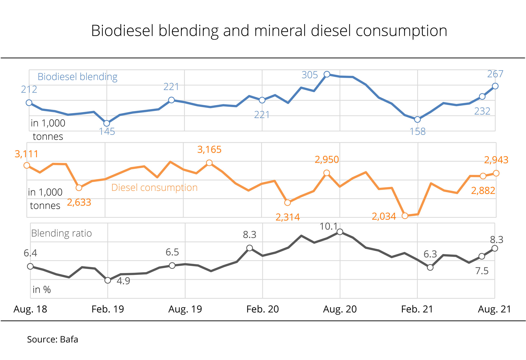 The percentage of biodiesel contained in diesel fuels rose to 8.3 per cent in August, the highest level in ten months.