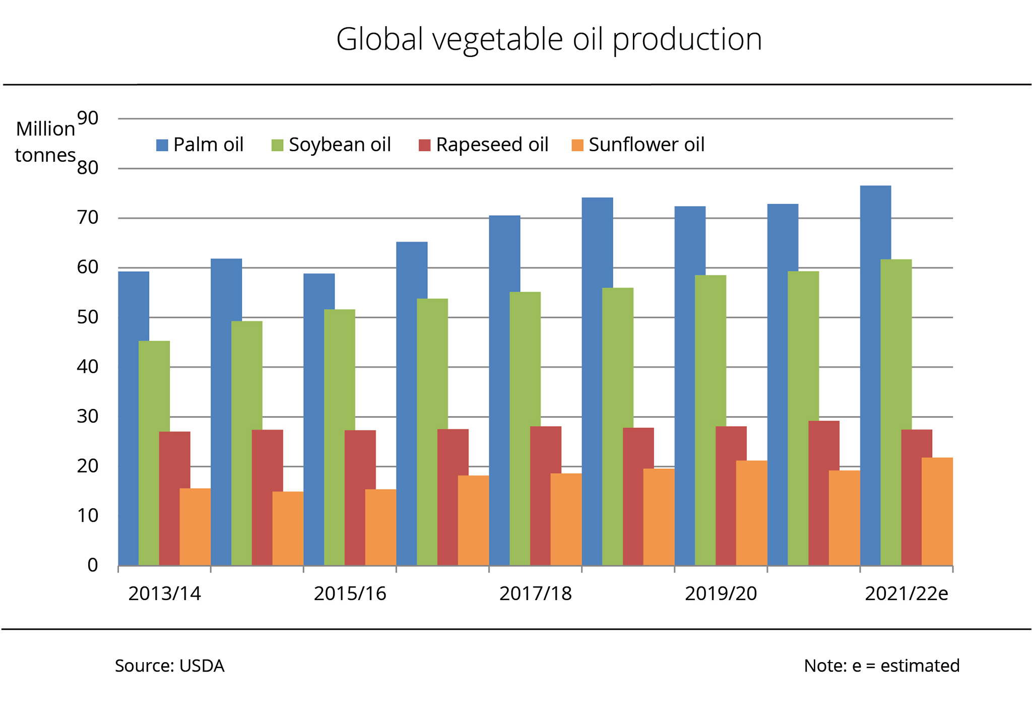 Global production of vegetable oils continues to increase in the 2021/22 crop year to reach new record highs. An expected decline in rapeseed oil output can be more than offset by production increases in palm, sunflower and soybean oil.