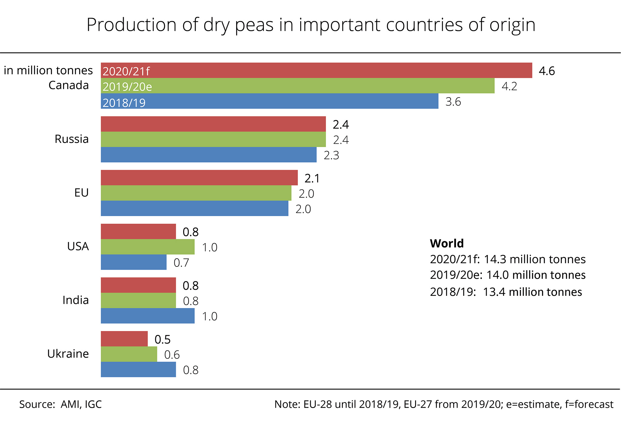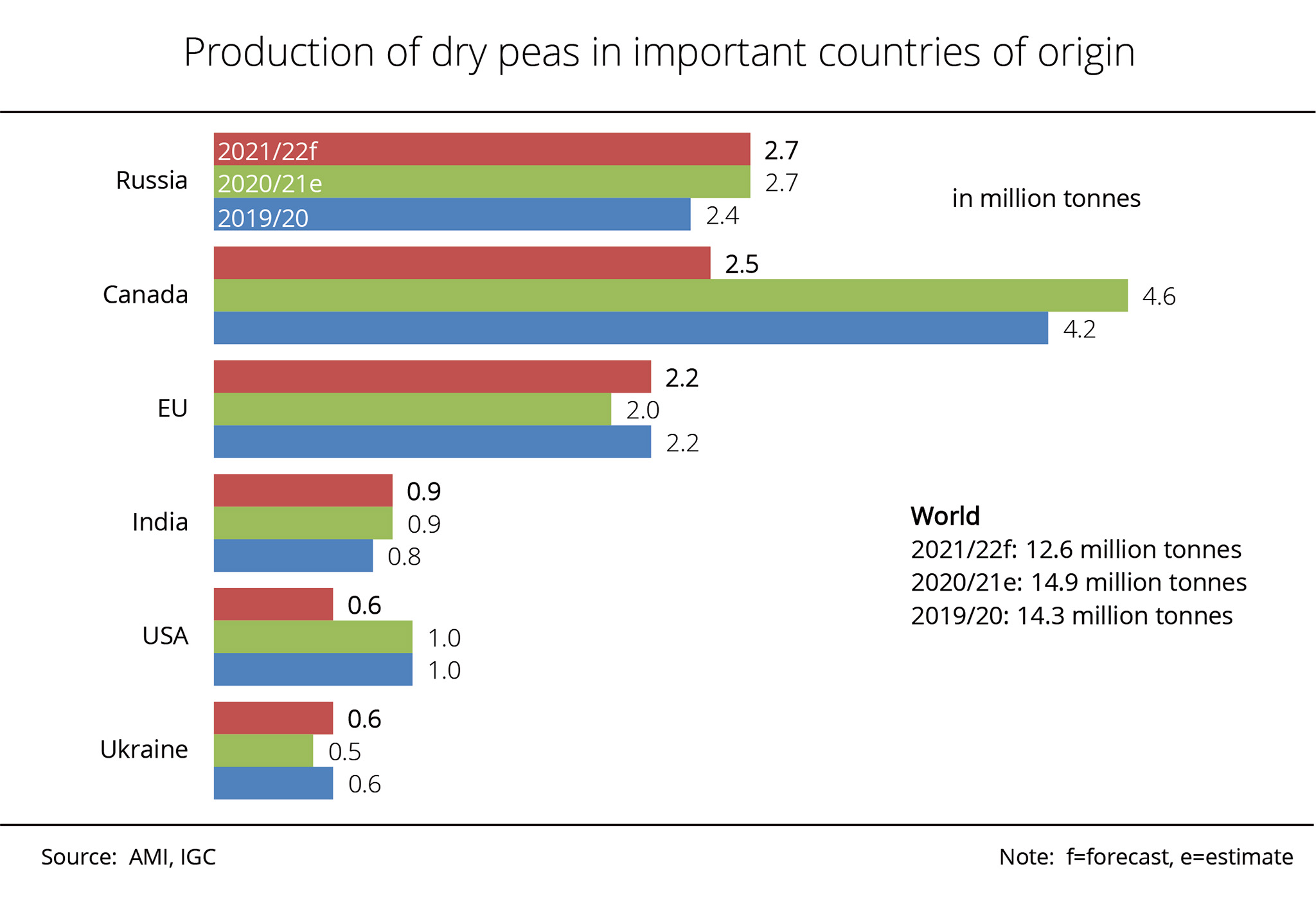 Russia moved to the top of the list of dry pea producers with an output of 2.7 million tonnes, although the harvest was around 1.5 per cent smaller than the previous year. The EU-27 follows in third place with production amounting to 2.2 million tonnes. This translates to a 7 per cent increase over 2020 and is due to an expansion in dry pea area in Germany and France. Also, France harvested outstanding yields that were impossible to achieve in Germany due to poor weather conditions.