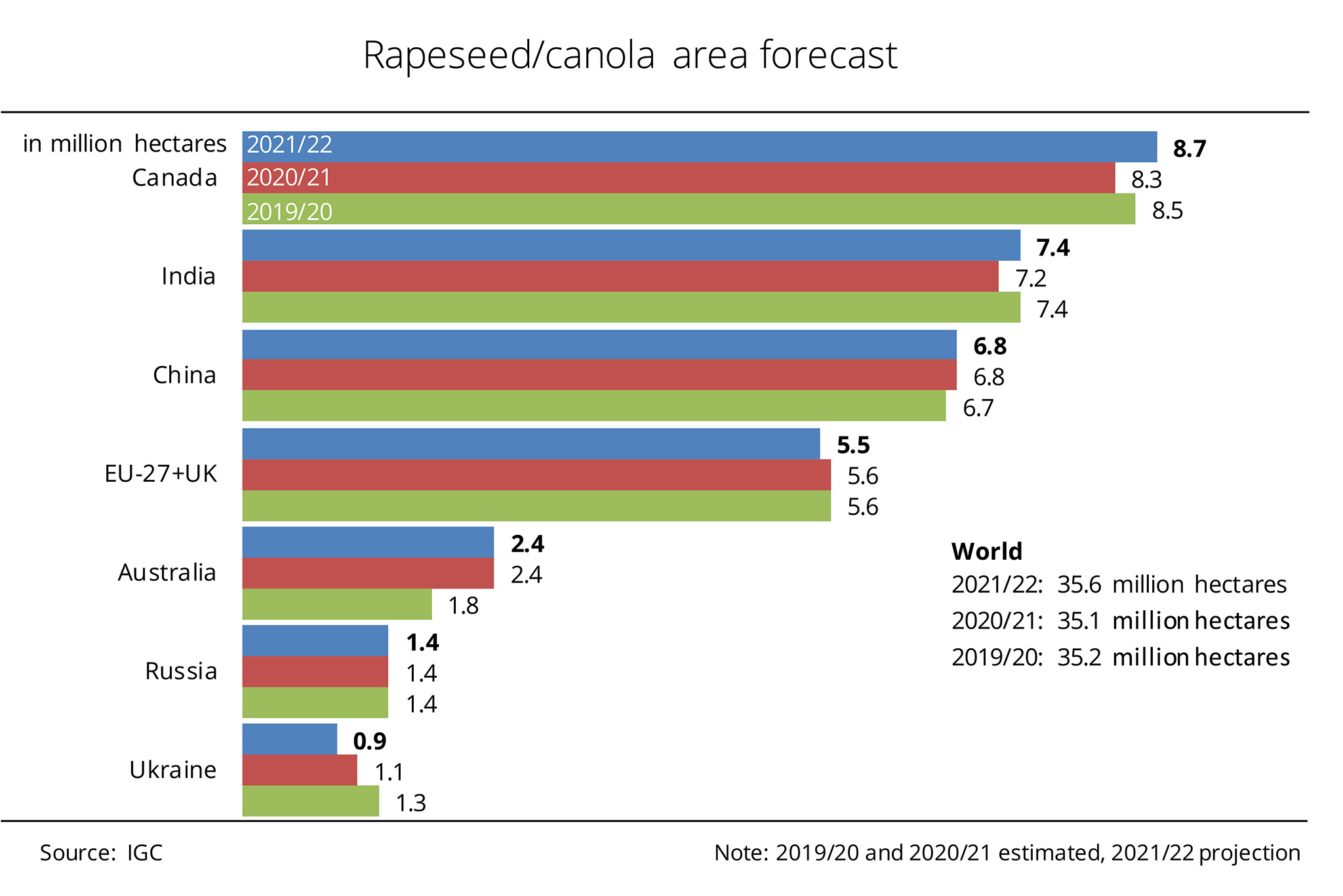 Declines in area in Ukraine and the EU-27 plus UK will presumably be more than offset by area increases in other major rapeseed-producing countries in 2021/22.