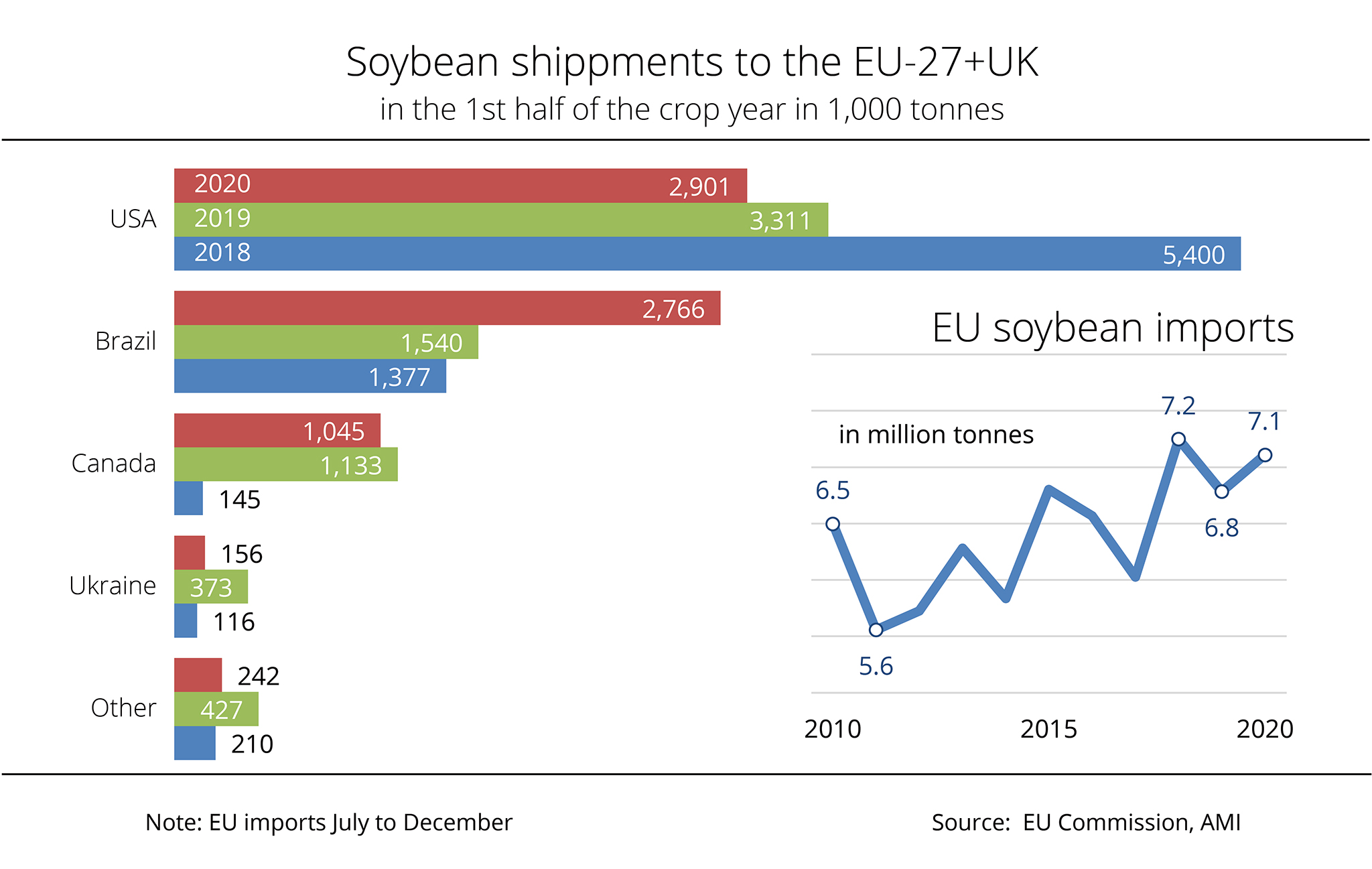 As a consequence, EU demand has been covered to a greater extent by soybean imports from Brazil. These imports amounted to around 2.8 million tonnes between July and December 2020. This was just about twice the amount of the previous year. The third most important supplier was Canada, followed by Ukraine and Serbia.