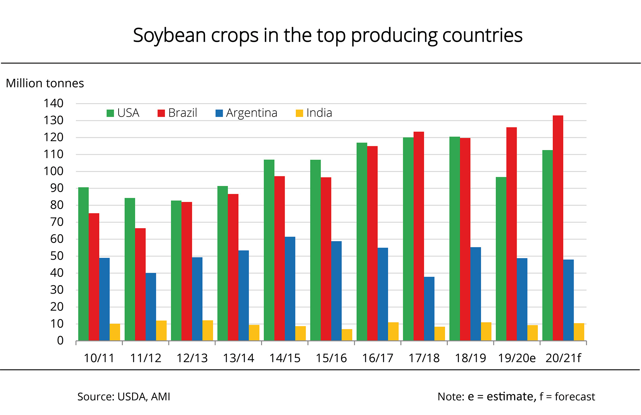 Brazil, the US and Argentina are the largest soybean-producing countries worldwide. Together, they produce more than 80 per cent of the world's soybeans. India follows a long way behind. The country will likely harvest around 3 per cent of global soybeans in 2020/21. According to an USDA report, Brazil is set to harvest a record soybean crop of 133 million tonnes in the current crop year, which would be up around 7 million tonnes from the previous year. The drought-related planting delays at the end of 2020 appear to cause delays also in harvesting, but, according to the USDA, are unlikely to lead to reductions in yields. Brazil is consolidating its number one position ahead of the US based on a 1.7 million hectare expansion in area planted. In the US, the soybean harvest was already complete at the beginning of November 2020. It amounted to around 113 million tonnes. This translates to a rise of 16 million tonnes year on year.