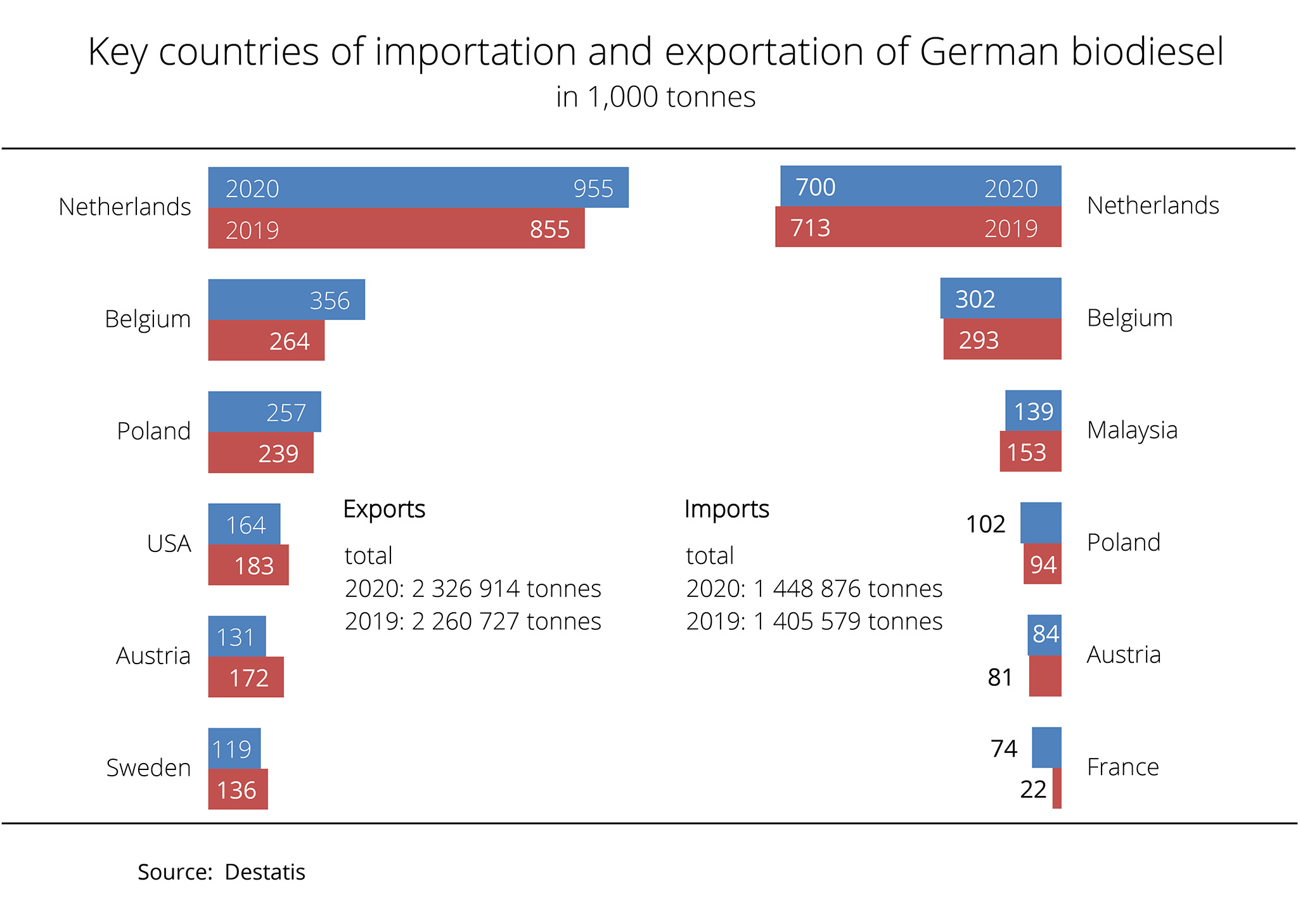 With exports amounting to approximately 2.33 million tonnes and an export surplus of approximately 0.9 million tonnes, Germany underlines its importance for the production and marketing of biodiesel in the European Union. This has been stated by the Union zur Förderung von Oel- und Proteinpflanzen (UFOP) with reference to current official statistics. German biodiesel imports totalled approximately 1.45 million tonnes. The Netherlands were once more the by far most important recipient and exporting country, with approximately 1 million tonnes and 0.7 million tonnes respectively. In the calendar year 2020, Germany imported and exported more biodiesel than ever before.
