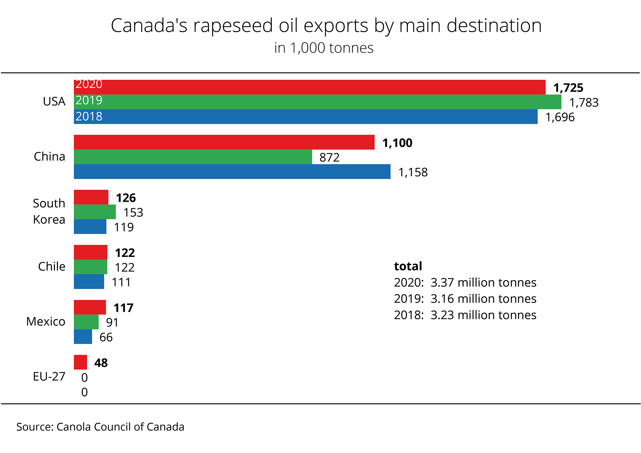 Canada exported more canola oil in 2020 than in previous years. As usual, the largest volumes went to the US and China, but the EU-27 also reappeared as a buyer.