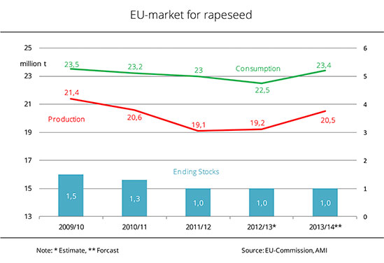 Brussels forecasts a 2013 EU rapeseed crop of 20.5 million tonnes. The 1.3 million tonne rise over the previous year is due to a 7 per cent increase in area planted. Average yields are at the year-ago level of 31.1 decitonnes per hectare. The larger global supply of rapeseed and the resulting lower market prices stimulate demand. Consumption is expected to surge back to more than 23 million tonnes in the 2013/14 marketing year. Crushing is forecast at 22.5 million tonnes, compared to only 21.7 million tonnes the previous year. The EU Commission estimates import demand at 3 million tonnes, 0.4 million tonnes lower than 2012/13. In other words, the final stocks of 1 million tonnes could remain untouched. The International Grain Council (IGC) in London even expects EU rapeseed ending stocks to rise. A year ago, the ICG still put stocks at 1.3 million tonnes. In 2013/14, the figure could climb to 1.9 million tonnes, a high level not seen in recent years. (AMI)