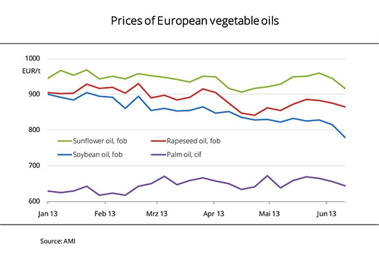 The weakness on the vegetable oil markets continues. Buyers wait for the supply of vegetable oils from the new crop. Slackness of demand is bound to continue until such supply will be available. Vegetable oils are in short supply and predominantly requested to cover nearby demand. In July 2013, nearby rapeseed oil was available at very high premiums only. In the west of Germany, supply had run very low by mid month. Rapeseed and soybean oils for delivery from November 2013 are hardly traded at all. Rapeseed and soybean oils for September delivery have recently been valued at the same levels. The recent price fob Hamburg was EUR 728 per tonne. In other words, rapeseed oil was down EUR 72 EUR per tonne from the previous month. Reductions in prices for soybean oil were less sharp, amounting to EUR 39 EUR per tonne. Bids for soybean and rapeseed oil raffinates are currently only made on demand. Nearby sunflower oil is short in supply and buyers must fork out high premium charges as a result. (AMI)