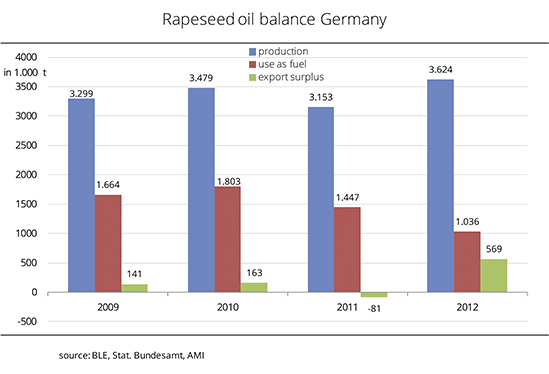 Less and less rapeseed oil from German oil mills is used for biodiesel fuel production. Since other uses such as cooking oil and food and other technical oils have very little potential for development, the domestic market offers few marketing possibilities. As a result, more rapeseed oil moves to the export sector. Other EU countries are the main buyers, with the number one, the Netherlands, buying up close to 40% of total German exports (300,000 tonnes) in 2012. Belgium and Great Britain (just under 100,000 tonnes each) were the number two and three buyers respectively. According to information published by the Bundesanstalt für Landwirtschaft (the German Federal Office for Agriculture and Food), the amount of German rapeseed oil used for biodiesel fuel production slumped to 1.036 million tonnes in 2012. This was 28% down on 2011 and even 43% less than 2010. Due to buoyant demand from abroad, German oil mills produced around 3.6 million tonnes of rapeseed oil in 2012. This was a 15% increase over 2011.