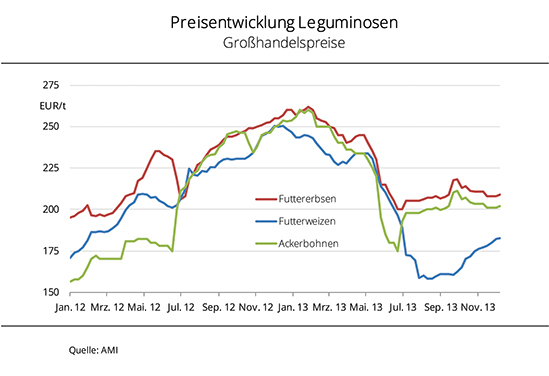 Nicht so stark wie für Getreide, gab es auch für Hülsenfrüchte in diesem Jahr einen kräftigen Preisknick, obwohl die Ernten 2013 in Deutschland geringer ausfielen als im Vorjahr. Aber der Druck vom Getreidemarkt und von den internationalen Proteinmärkten öffnete auch für heimische Hülsenfrüchte den Preisspielraum nach unten. Von diesem Tief konnten sie sich jedoch schnell erholen. Stetige Nachfrage bei gleichzeitig unzureichendem Angebot sorgte für steigende Erzeugerpreise, die sich nach der Hauptvermarktungsphase im August/September 2013 stabilisierten und seither wenig verändert haben. Damit schrumpfte Anfang Dezember 2013 der Preisabstand von Futtererbsen gegenüber Futterweizen auf 26 EUR/t. Im August lag er noch bei über 55 EUR/t. Im Vorjahr waren es höchstens 28 EUR/t gewesen. (AMI)