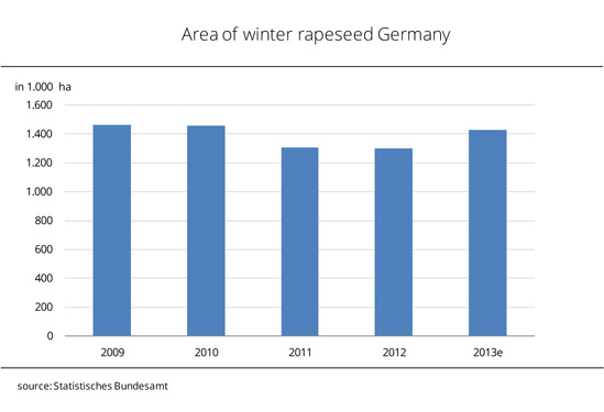 The acreage of winter rapeseed in Germany for the 2013 harvest has been expanded. According to the German Federal Statistical Office, rapeseed growers in Germany planted around 1.43 million hectares with winter rapeseed for the 2013 harvest season. This acreage is 8 per cent up on the previous year. In the majority of German states, the expansion was minimal. However, winter rapeseed cropland in Schleswig-Holstein (+89 per cent) and Mecklenburg-Western Pomerania (+24 per cent) went up considerably on the previous year. On the other hand, in Bavaria and Thuringia areas planted with winter oilseed rape were down 1 per cent. (AMI)