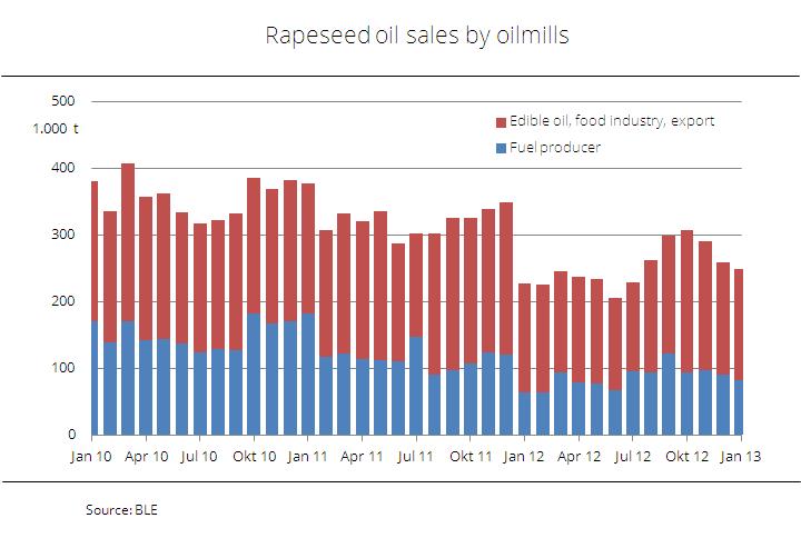 According to information published by the Bundesanstalt für Landwirtschaft (the German Federal Office for Agriculture and Food), German oil mills processed around 8.4 million tonnes of rapeseed in the 2012 calendar year. The office estimates that the oil mills produced approximately 3.6 million tonnes of rapeseed oil. This was around 435,000 tonnes up year-on-year and more than in any of the past five calendar years. Of the rapeseed oil produced in 2012, 3 million tonnes were sold to processors. Of this quantity of rapeseed oil, fuel producers purchased 1.04 million tonnes for use as feedstock. This was less than ever before. As a result, only 34 % of the total sales were for use in fuel production. This was a drop from 37 % in 2011 and even from 43 % in 2009. (AMI)