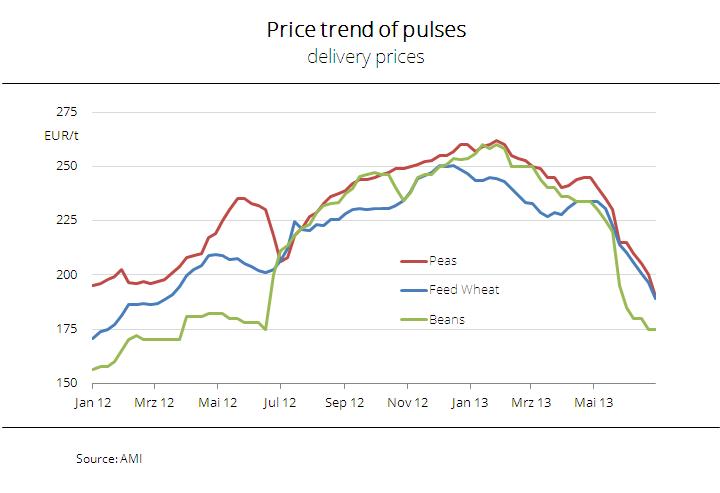 The increase in asking prices for cereals and proteins on the cash market were also reflected in the price trend for pulses. According to the weekly AMI survey, producer prices of fodder peas closely followed fodder wheat prices in the 2012/13 marketing year, averaging a 20% increase over the previous year level. Prices of broad beans climbed even higher. At EUR 238 per tonne, they were not only nearly identical to those of fodder peas (in 2011/12, the price gap had been EUR 36 per tonne), but also 42% up on the previous year level. (AMI)
