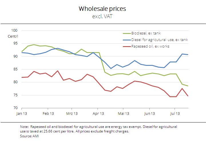 In terms of closing the loop of local resources, using vegetable oil and biodiesel in agriculture and forestry seems the natural choice. In Germany, full tax privileges are still attached to these types of fuels. Although energy tax to be paid amounts to 45.07 cent per litre, it is fully refunded under the procedure of the agricultural diesel tax refund. In the case of diesel fuel, the pro rata refund is 21,48 cents per litre. The difference in tax advantages reflects the savings at the wholesale level. However, it is also the trend in the prices of the fuels shown in the chart that determines the difference in price. If pressure on new-crop rapeseed oil continues to increase, switching will become more and more attractive, particularly if the price of diesel rises. Tax on the corresponding quantities of pure fuel could subsequently be recaptured in conjunction with quota trading in order to meet the quota obligation. The chart shows wholesale prices. In other words, it does not reflect freight or delivery costs or quantity-related discounts, if any. (AMI)