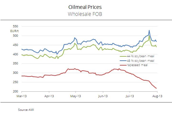 Following a relatively stable price trend in the first quarter of 2013, German cash market oilseed meal prices have recently matched the upward trend of stock price quotes for feedstock. This rise curbs demand. Supply in nearby positions is moderate anyway, but demand is also sluggish. At the end of April, prices asked fob Hamburg rallied to EUR 460 per tonne for low-protein soybean meal (44%) and to EUR 490 per tonne for highprotein soybean meal (48%). Such levels were last seen in September 2012. However, they did not last long, because quotations for raw material were also in decline. The upsurge in prices for rapeseed meal (up EUR 4 to EUR 323 per tonne) was not quite so sharp at the end of April 2013. However, recent asking prices (EUR 311 per tonne) still exceeded the year-ago level by EUR 56 per tonne. (AMI)