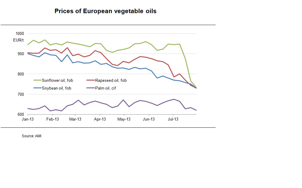 The weakness on the vegetable oil markets continues. Buyers wait for the supply of vegetable oils from the new crop. Slackness of demand is bound to continue until such supply will be available. Vegetable oils are in short supply and predominantly requested to cover nearby demand. In July 2013, nearby rapeseed oil was available at very high premiums only. In the west of Germany, supply had run very low by mid month. Rapeseed and soybean oils for delivery from November 2013 are hardly traded at all. Rapeseed and soybean oils for September delivery have recently been valued at the same levels. The recent price fob Hamburg was EUR 728 per tonne. In other words, rapeseed oil was down EUR 72 EUR per tonne from the previous month. Reductions in prices for soybean oil were less sharp, amounting to EUR 39 EUR per tonne. Bids for soybean and rapeseed oil raffinates are currently only made on demand. Nearby sunflower oil is short in supply and buyers must fork out high premium charges as a result. (AMI)