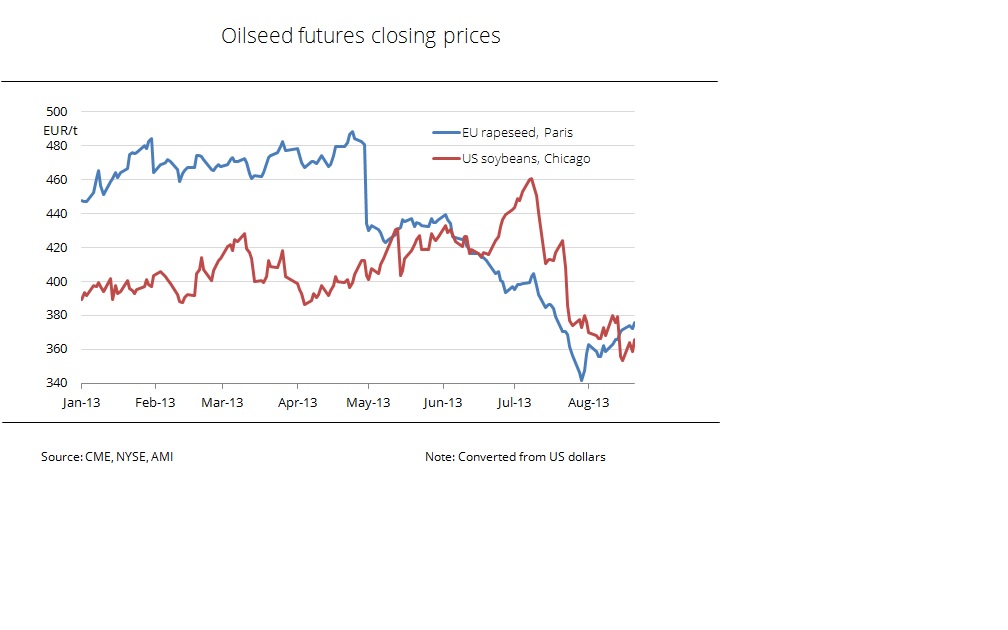 In view of a foreseeable larger 2013 EU rapeseed crop, prices slumped in May 2013 as the nearby changed from the old-crop May contract to the new-crop August contract. Exceptional weather raised doubts concerning the yield potential and in June 2013 prices rose slightly as a result. However, the first positive crop figures sent prices tumbling to EUR 342 per tonne, a level last seen in July 2010. Not even the very firm US soybean prices were able to slow this downward trend. Soybean prices rose sharply in response to poor planting and growing conditions. Prospects of a US record crop then depressed prices even in Chicago and also affected rapeseed prices in Paris. However, the weakness in the market appears to have ended. Above all, the firm soybean prices are making an impact. The current drought in the US is increasing concern about the harvest. (AMI)