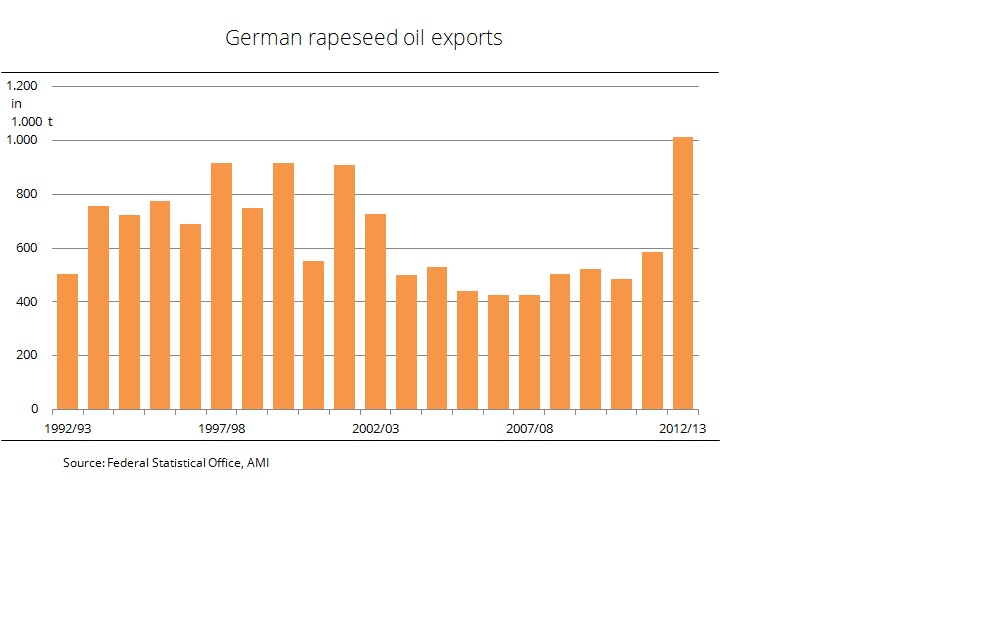 Germany had a record-breaking 2012/13 in rapeseed oil exports. Never before had the country sold as many as one million tonnes abroad. In 2011/12, exports amounted to 586,000 tonnes. German production of rapeseed oil production in 2012/13 totalled around 3.8 million tonnes. Due to weak national demand, German oil mills had to sell one third of their production to foreign markets. 87 per cent of these exports went to other EU states, 8 per cent to Asia and 4 per cent to EFTA states (Iceland, Norway and Switzerland). The main buyer of German rapeseed oil were the Netherlands (just under 440,000 tonnes), followed by Belgium (120,000 tonnes). Taken together, the two countries received 80 per cent more than the previous year. China (42,000 tonnes) ranked fifth, after Great Britain and Poland and ahead of Norway (37,000 tonnes). France only received 36,000 tonnes. However, 30,000 tonnes went to Singapore. In previous years, China and Singapore had only received a fraction of this year's quantity. (AMI)