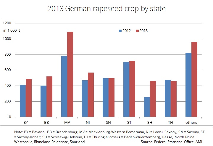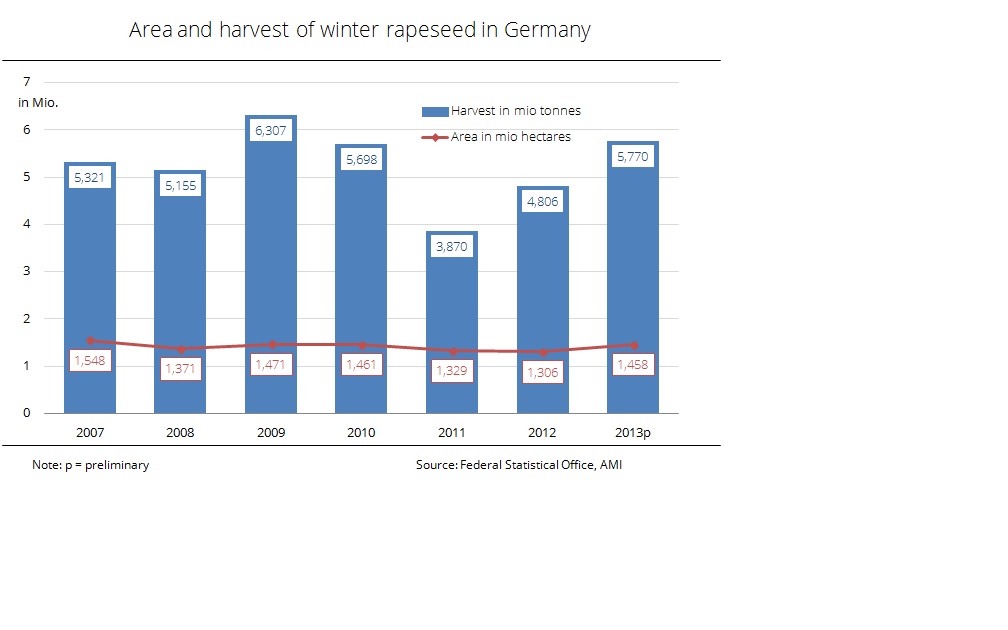 The 2013 rapeseed harvest in Germany was surprisingly good. Despite unfavourable growing conditions, the harvest figures markedly exceeded the previous year's levels in all German states but Thuringia. According to the final German Federal Statistical Office estimate, the German rapeseed crop totalled 5.78 million tonnes, 20 per cent more than 2012. The almost one million tonnes increase was due to both a rise in area planted and higher yields. Good conditions at the time of planting enabled farmers to keep to schedule for the first time in three years. As a result, they planted 1.46 million hectares, around 12 % more than 2012. Contrary to expectations and despite the long winter, the crops benefited from the cold and wet weather in May. At 39.6 decitonnes per hectare, yields outpaced the long-term average by 7 per cent. In Mecklenburg-Western Pomerania alone, the rapeseed crop (1.09 million tonnes) was up 40 per cent on 2012, in Schleswig-Holstein the rise amounted to 80 per cent. (AMI)