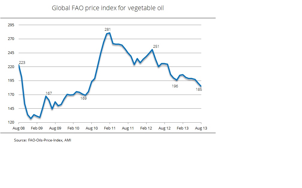 The FAO Fats/Oils Price Index dropped to 185.5 points in August, 3 per cent below the July figure. This price level was last seen in 2010. The decline in prices for vegetable oil has been unbroken since February 2013. The main factor driving the recent slump in vegetable oil prices is the increase in palm oil supplies in Southeast Asia. The output of palm oil has exceeded expectations, whereas demand has hardly risen compared with the same period a year ago. At the same time, prices for soybean oil have also been on a downward trend. Ample supply from Argentina and initially very high forecasts of the 2013/14 global soybean crop put pressure on prices. Poor growing conditions for the US soy crop have stopped the fall in soybean oil prices for the time being. However, in view of the 7 million tonne rise in global vegetable oil production in the 2013/14 marketing year and the simultaneous increase in ending stocks, there remains some scope for downward prices. (AMI)