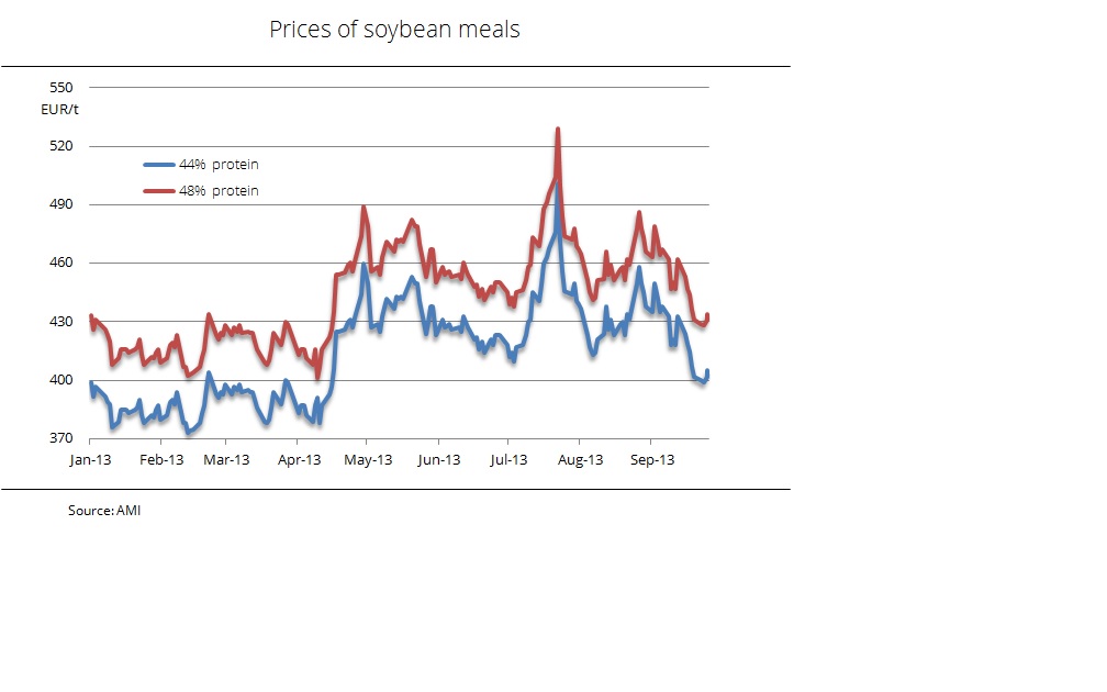 Although prices of soybean meals have recently dipped, they still remain at a high level. The market had anticipated an early September decline in prices, at the time when the US soybean harvest usually starts. However, this year harvesting is delayed due to poor weather conditions during the crop cycle. Moreover, the initial crop forecasts will likely not be met. Over the past few months, official harvest outlooks have continually been lowered, and the most recent estimate of US soybean production was down to 85.7 million tonnes, only 3.7 million tonnes above the 2012 level. These prospects not only maintain prices at a high level, but have also lend to a very volatile price trend over the past few weeks. In the third week of September, the asking price for soybean meal (44% protein) averaged EUR 413 per tonne, slightly down from the previous 2013 average of EUR 415 per tonne. At the same time a year ago, the average price amounted to EUR 502 per tonne. (AMI)