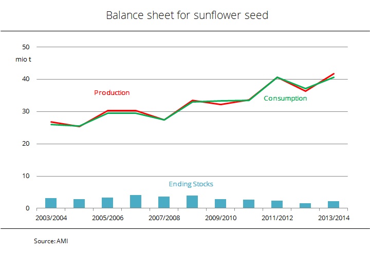 The USDA expects a record global sunflower seed crop of 41.76 million tonnes for 2013/14 due to increased planted areas and a foreseeable rise in yields. This figure would top the 2012/13 level by 5.4 million tonnes. Considerably increased crop expectations on the northern hemisphere play a major role. Compared to 2012/13, the 2013/14 sunflower seed crop is expected to rise 2.5 million tonnes in the Ukraine, 1.4 million tonnes in the EU-28 and just under 1 million tonnes in Russia. As a result, the Black Sea region alone would provide 21.8 million tonnes of sunflower seed. Sunflower seed has the lowest shelf life of all oilseeds. As a result, it only accounts for less than 4 per cent of the world oilseed trade. The main production areas process the seed locally. The principal product of sunflower seed processing on the market is high-quality sunflower seed oil, of which the former CIS countries are the top suppliers. The Ukraine sells 86 per cent of is sunflower oil production on the world market, Russia 35 per cent. The EU-28 is a net importer of sunflower oil. (AMI)