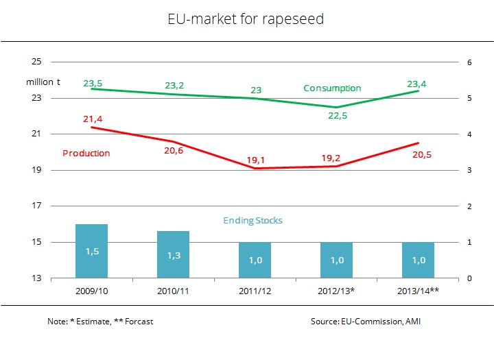 Brussels forecasts a 2013 EU rapeseed crop of 20.5 million tonnes. The 1.3 million tonne rise over the previous year is due to a 7 per cent increase in area planted. Average yields are at the year-ago level of 31.1 decitonnes per hectare. The larger global supply of rapeseed and the resulting lower market prices stimulate demand. Consumption is expected to surge back to more than 23 million tonnes in the 2013/14 marketing year. Crushing is forecast at 22.5 million tonnes, compared to only 21.7 million tonnes the previous year. The EU Commission estimates import demand at 3 million tonnes, 0.4 million tonnes lower than 2012/13. In other words, the final stocks of 1 million tonnes could remain untouched. The International Grain Council (IGC) in London even expects EU rapeseed ending stocks to rise. A year ago, the ICG still put stocks at 1.3 million tonnes. In 2013/14, the figure could climb to 1.9 million tonnes, a high level not seen in recent years. (AMI)