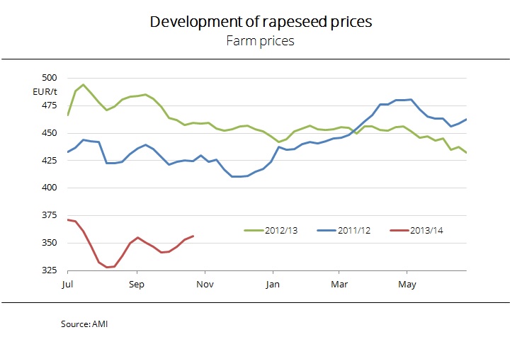 Following the price slump at the time of harvest, rapeseed prices stabilized in September 2013 and have persisted at the higher level also in October. The key factorfor the recovery was the developments at the European and overseas futures exchanges, because in the German cash market, trade has been slow. The majority of the 2013 rapeseed harvest has already been sold and farmers are still speculating for an increase in price of the remaining quantities, which have already been put in the traders' stores. After all, there has been an enormous 111 EUR per tonne price drop from the previous year. Prices are anticipated to change little over the next few weeks. As the northern hemisphere oilseed harvest is almost complete, no big surprises are expected and as a result there will be hardly any stimulus for price movements. In the last quarter of 2013, the market focuses on the development of soybeans in South America. Although in Argentina soy crop development is way behind schedule because of the severe drought, experts forecast a new record overall crop. As a result, buyers are speculating for a decline in prices. This same trend was also observed in the two previous years. (AMI)