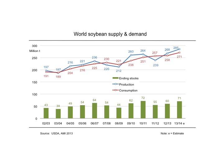 The USDA gives an optimistic outlook on soybean production. Global soybean production is expected to rise to 286 million tonnes in the 2013/14 marketing year, up 16 million tonnes from a year ago. It would be by far the largest amount of soybeans ever produced. US farmers are currently sowing in less than ideal weather conditions. In South America, the last soybean fields have just been cleared and it is still five months to go until sowing. Nevertheless, the USDA forecasts the soybean area to expand because of the benefits the crop offers to farmers. For example, it has a greater resistance to drought than maize, while also enabling farmers to create more added value. However, harvest estimates remain very vague. The key factor influencing the crop is the growing conditions. A year ago, the USDA had also forecast a record crop in the US, but a drought eroded these prospects. (AMI)