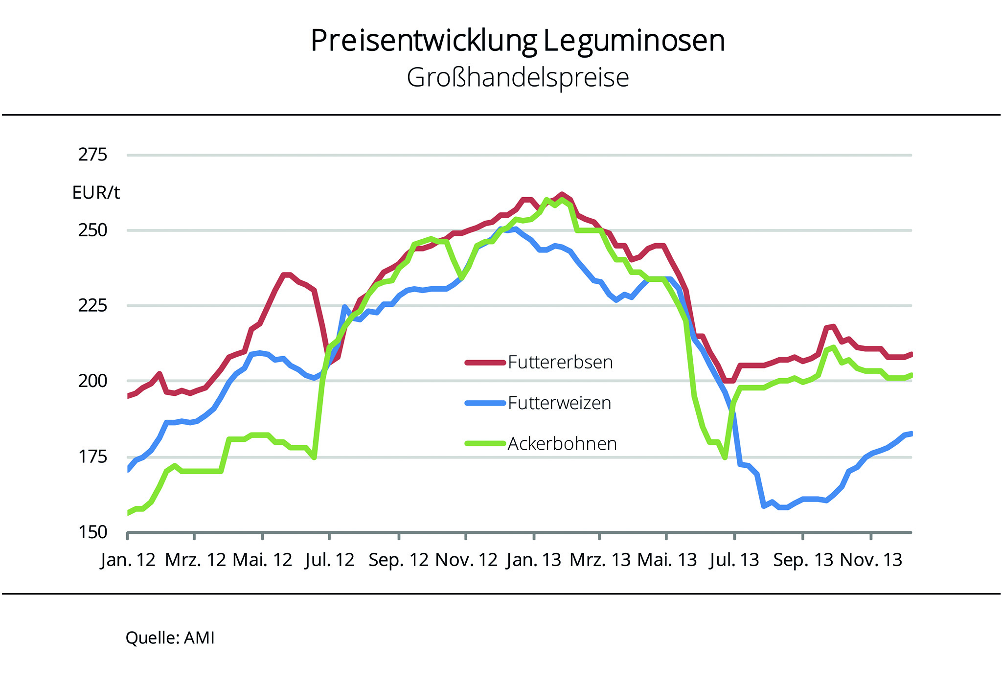 Nicht so stark wie für Getreide, gab es auch für Hülsenfrüchte in diesem Jahr einen kräftigen Preisknick, obwohl die Ernten 2013 in Deutschland geringer ausfielen als im Vorjahr. Aber der Druck vom Getreidemarkt und von den internationalen Proteinmärkten öffnete auch für heimische Hülsenfrüchte den Preisspielraum nach unten. Von diesem Tief konnten sie sich jedoch schnell erholen. Stetige Nachfrage bei gleichzeitig unzureichendem Angebot sorgte für steigende Erzeugerpreise, die sich nach der Hauptvermarktungsphase im August/September 2013 stabilisierten und seither wenig verändert haben. Damit schrumpfte Anfang Dezember 2013 der Preisabstand von Futtererbsen gegenüber Futterweizen auf 26 EUR/t. Im August lag er noch bei über 55 EUR/t. Im Vorjahr waren es höchstens 28 EUR/t gewesen. (AMI)