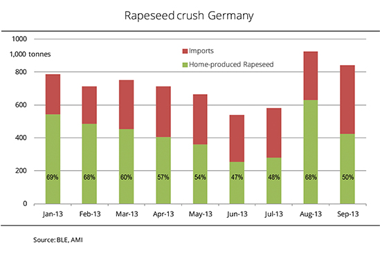 About 6.5 million tonnes of rapeseed have been processed since the beginning of the calendar year. There was a seasonal decline in processing at the end of the 2012/13 marketing year. At the same time, the proportion of German rapeseed processed decreased. The drop was due to the small 2012 German rapeseed harvest and resulting hike in feedstock prices. By contrast, the 2013 rapeseed crop was significantly larger. At 5.8 million tonnes, it exceeded the previous year's harvest figure by 1 million tonnes. However, the harvest came in very late. In other words, German oil mills were short of material in July 2013. Extensive rapeseed processing did not recommence until August 2013, with a substantial increase in domestic rapeseed. Since January 2013, Germany has absorbed around 3.3 million tonnes of rapeseed from abroad, of which 77 per cent came from EU countries, 15 per cent from Australia and 4 per cent from the Ukraine. (AMI)