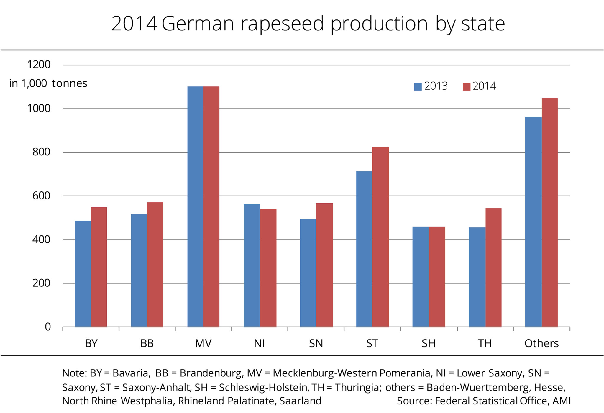 Compared to the area harvested in 2013, the acreage sown with winter rapeseed for the 2014 harvest season is slightly reduced. The German Federal Statistical Office reports that around 1.43 million hectares were sown with winter rapeseed, 1.8 per cent down on the previous year. The biggest drop from 2013, both absolutely and as a percentage, is seen in Mecklenburg-Western Pomerania, at 7 per cent and 18,500 hectares respectively. In North Rhine Westphalia and the Saarland, the decline in winter rapeseed area is estimated at 5 per cent. By contrast, Brandenburg and Lower Saxony report a rise. Saxony, Saxony-Anhalt, Thuringia, Schleswig-Holstein and Hessen all report virtually no changes in area sown. (AMI)