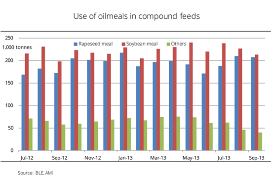 The use of rapeseed meal in compound feeds increased significantly over the first three months of the 2013/14 marketing year, to 207,000 tonnes in September 2013, around 20 per cent more year on year. A total of 604,000 tonnes of rapeseed meal was used in compound feeds in the first quarter of the current marketing year. This was 82,000 tonnes up on the same period a year ago. They key reasons were improved availability on the one hand and, on the other hand, higher competitiveness of proteins against other oilseed meals, above all against soybean meal. The use of soybean meal was on the decline, dropping to 213,000 tonnes in September 2013, 6 per cent down from August. However, use has increased from 2012/13. In the first quarter of 2013/14, the amount processed totalled around 677,000 tonnes, up 5 per cent year on year. In other words, rapeseed meal and soybean meal have displaced other oilseed meals, such as sunflower, linseed, palm and coconut meals, from the compounds. The amount of these other oilseed meals used in the compound feed industry dropped from 195,000 tonnes in July/September 2012 to 148,000 tonnes in the same period 2013. (AMI)