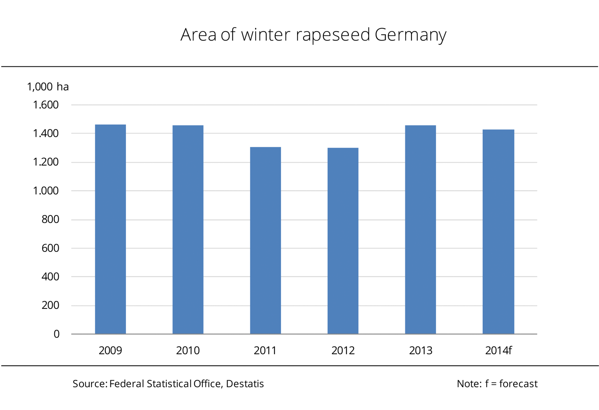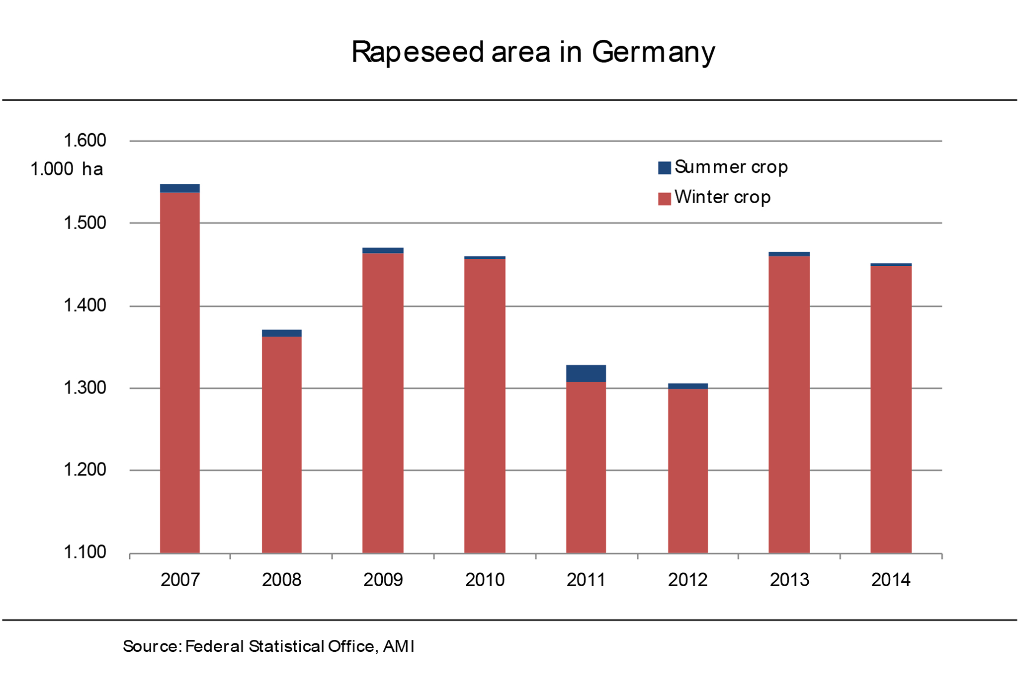 Compared to the area harvested in 2013, the acreage sown with winter rapeseed for the 2014 harvest season is slightly reduced. The German Federal Statistical Office reports that around 1.43 million hectares were sown with winter rapeseed, 1.8 per cent down on the previous year. The biggest drop from 2013, both absolutely and as a percentage, is seen in Mecklenburg-Western Pomerania, at 7 per cent and 18,500 hectares respectively. In North Rhine Westphalia and the Saarland, the decline in winter rapeseed area is estimated at 5 per cent. By contrast, Brandenburg and Lower Saxony report a rise. Saxony, Saxony-Anhalt, Thuringia, Schleswig-Holstein and Hessen all report virtually no changes in area sown. (AMI)