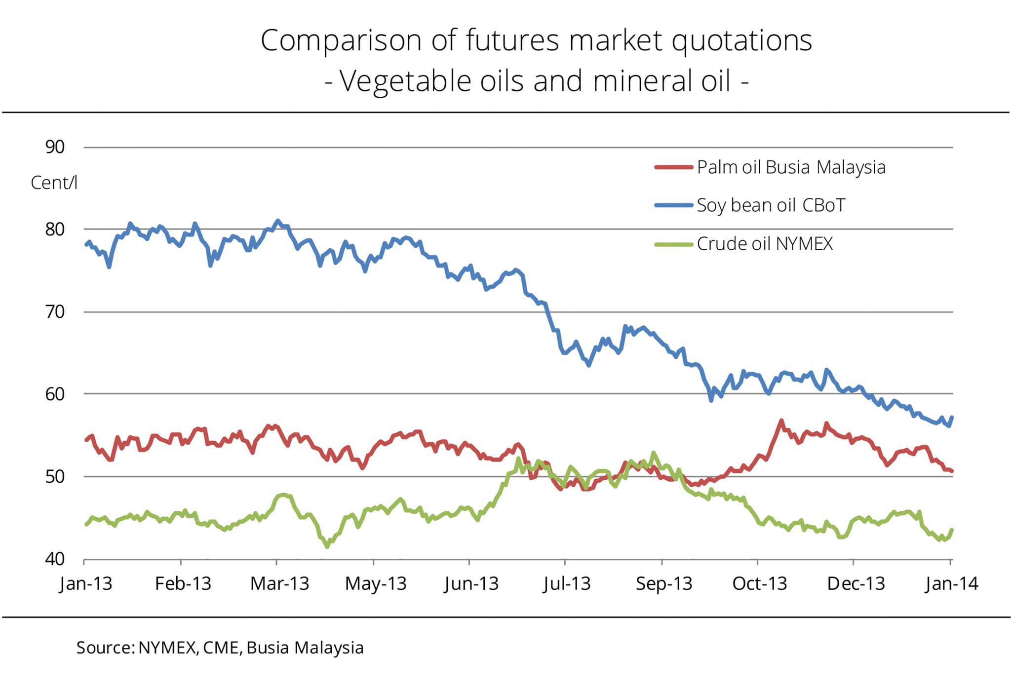 Palm oil has recently lost its competitive edge over mineral oil. Price curves have diverged again. In the summer months of 2013, forward prices for palm oil occasionally even fell below New York crude oil prices. Sluggish demand had led to an excessively large palm oil supply. In July 2013, the Malayan government responded by increasing the blending quota for biodiesel. The aim was to reduce the surplus of feedstock and cut expensive mineral oil imports. The decision also had a short-term impact on biodiesel exports, leading to a significant drop in export figures in August and September 2013. Whereas the spread between prices of palm oil and mineral oil has increased over the past few weeks, prices of soybean oil and mineral oil have been steadily converging. This trend improves the competitiveness of soybean oil for use in biodiesel production. In the US alone, production from January to October 2013 was almost 25 per cent up yearon-year. (AMI)