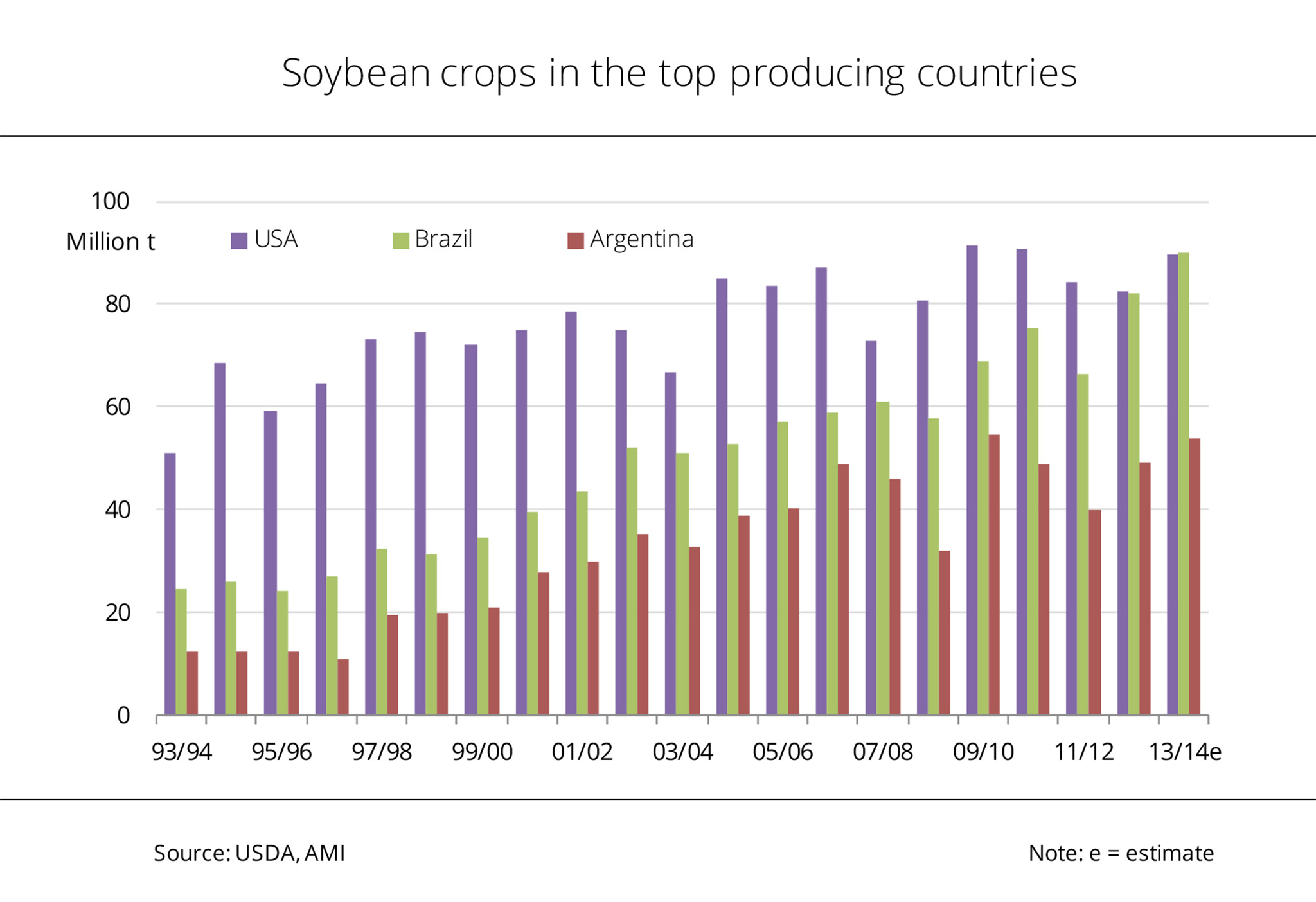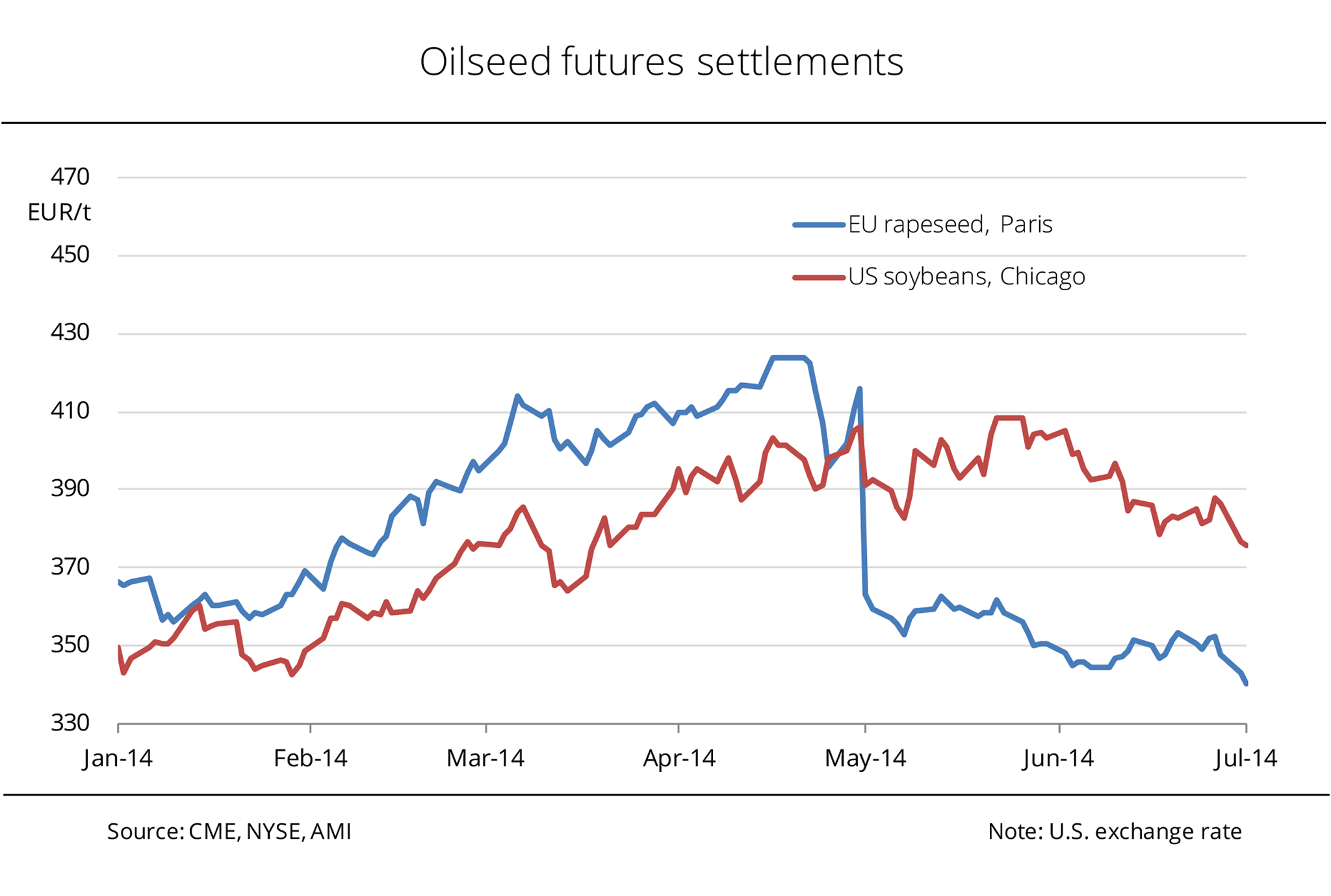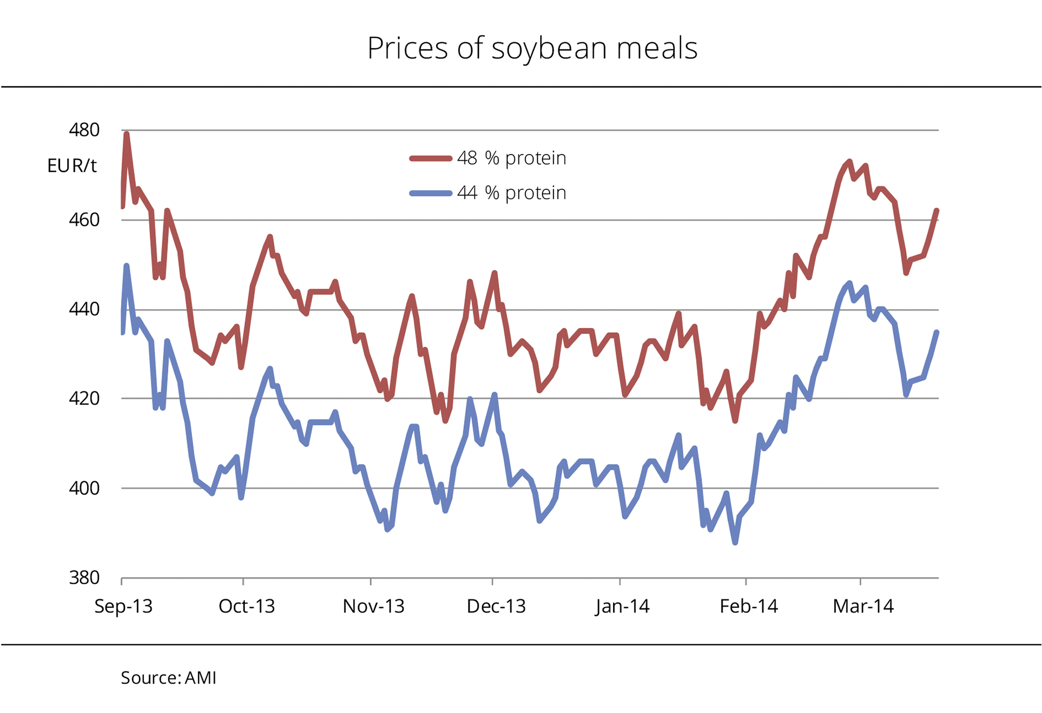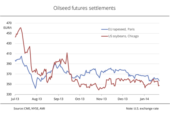 On 19 September 2013, prices for soybeans at the Chicago Stock Exchange tumbled below those for rapeseed in Paris after the high expectations on the 2013 US soybean crop were met. In the subsequent months, fluctuations were less pronounced because supply was more comfortable than the past marketing year. Since mid October 2013, rapeseed prices have gradually dropped by EUR 10 per tonne. Soybean prices were relatively stable at a level of approximately EUR 352 per tonne between the end of November 2013 and beginning of January 2014. At the beginning January 2014, prices of rapeseed and soybean temporarily converged as soybeans soared. In Argentina, the drought delayed soybean plantings and led to firming prices as a result. At the same time, China's demand for US soy was huge, sending prices in Chicago rocketing from EUR 349 per tonne to more than EUR 360 per tonne within two weeks. Most recently, improved conditions in Argentina have started to put pressure on prices again. (AMI)