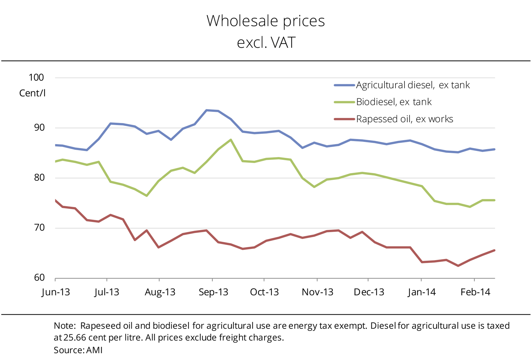 German wholesale prices for biodiesel currently stand at 75.58 euro cents per litre, a respectable 10 cents below agricultural diesel. In other words, the price gap between these fuels has widened. Since September 2013, prices for biodiesel have retreated. At the same time, demand and consumption have declined. Market participants expect this trend to stop when the summer fuel arrives by the second quarter of 2014. By contrast, prices for agricultural diesel are relatively stable at around 86 euro cents per litre. The recent sharp jump of crude oil prices in the US is not yet felt in Germany. The lack of impetus in the vegetable oil market drove rapeseed oil prices down. Not until mid January 2014 did firm prices for raw material send rapeseed oil climbing. Although the price slump stopped, prices now stand at 65.47 euro cents per litre, down 19 euro cents per litre year-on-year. In other words, rapeseed oil continues to be an attractive feedstock for producers of biofuels. (AMI)#