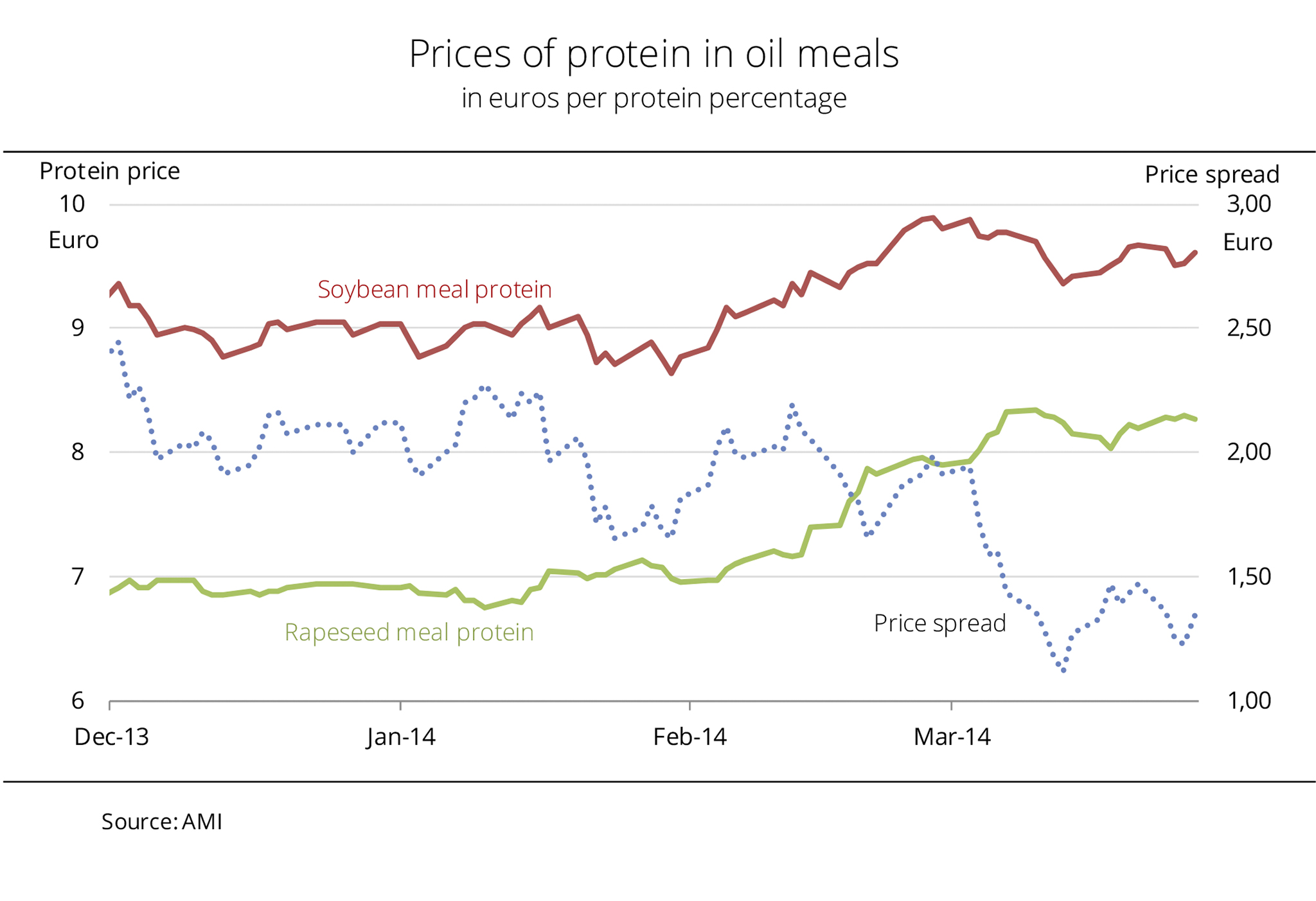 Since the beginning of February 2014, oilseed meal prices have surged sharply, with rapeseed meal outdoing soybean meal. The reason for the steeper rise of rapeseed meal prices was that the feedstock price firmed on climbing forward prices. Consequently, rapeseed meal has lost some of its competitiveness against soybean meal. The protein price spread, calculated from the spot market price and the protein content, narrowed rapidly. On 13 March 2014, the theoretical selling price of rapeseed meal protein hit the EUR 8 per tonne mark, thereby approaching the level of soybean meal protein. At EUR 1.12 per tonne, the spread was down to the lowest level in nine months. Most recently, the competitiveness of rapeseed meal against soybean meal has seen a slight increase. Whereas prices of rapeseed meal changed only modestly, soybean meal picked up sharply as feedstock prices climbed. (AMI)